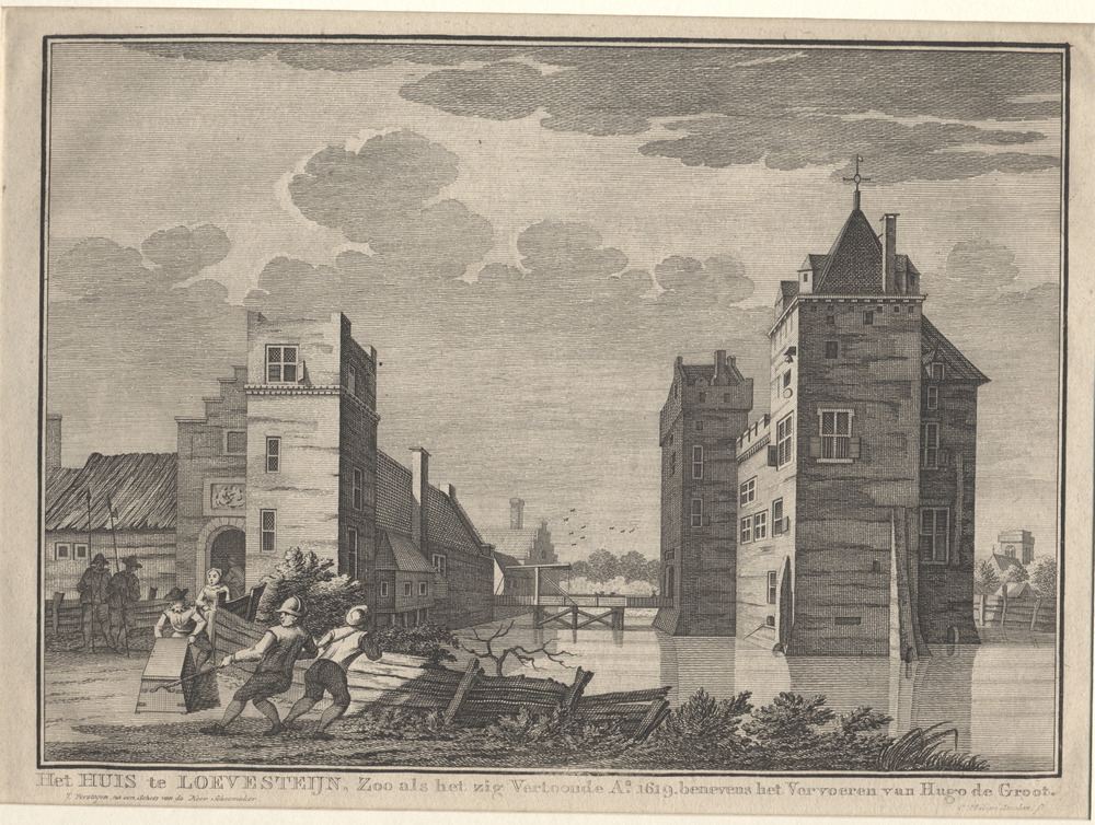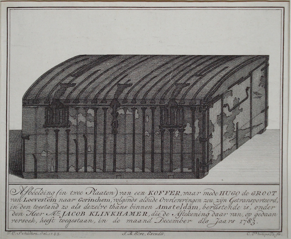 Gezicht op vervoer Hugo de Groot in boekenkist te Lo...