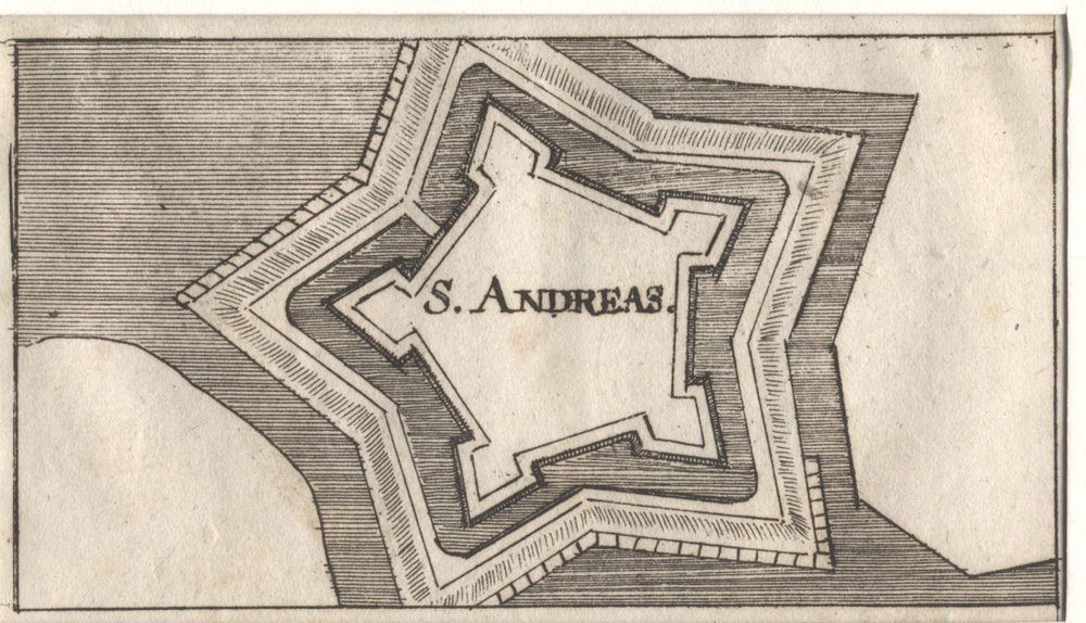 plattegrond van fort met grachten St. Andries. Gravure.