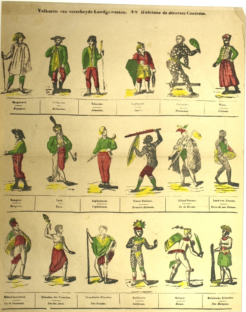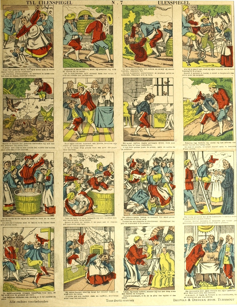 Centsprent met achttien gekleurde prentjes van figur...
