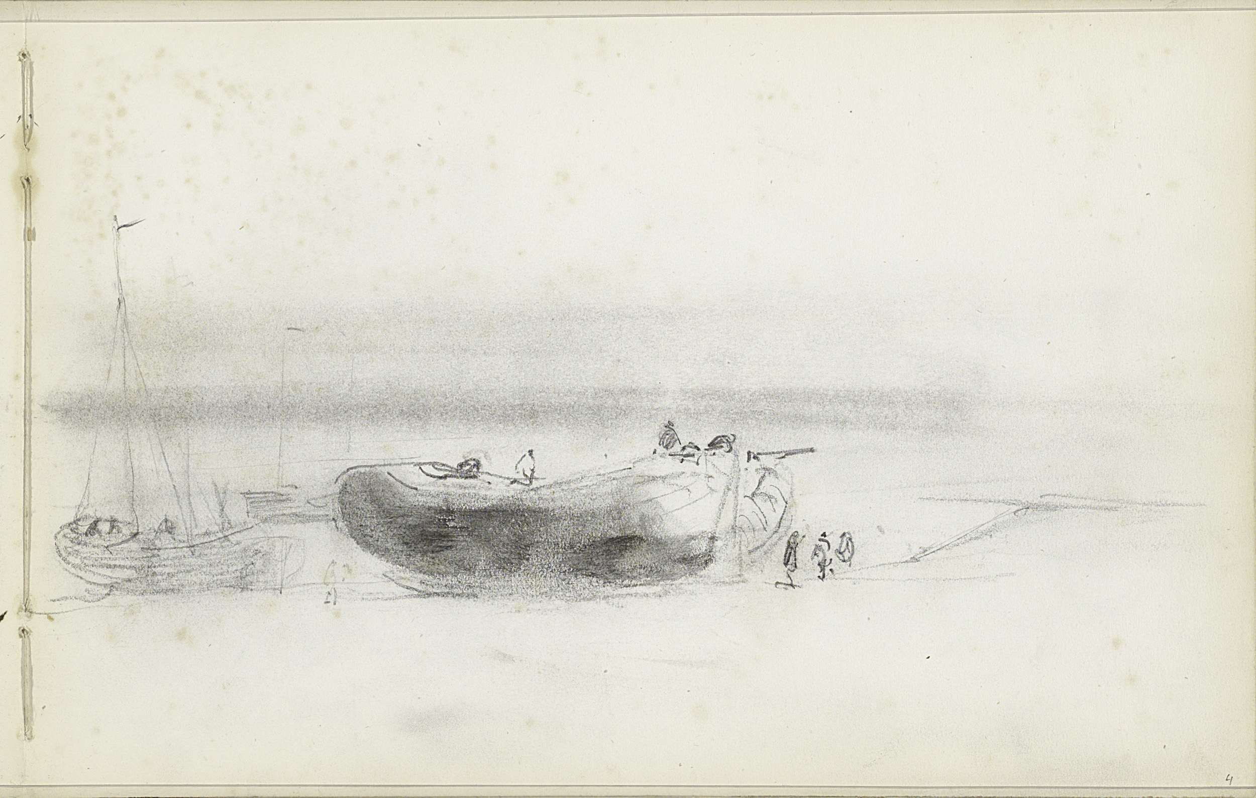 Figuren bij twee vissersboten op het strand