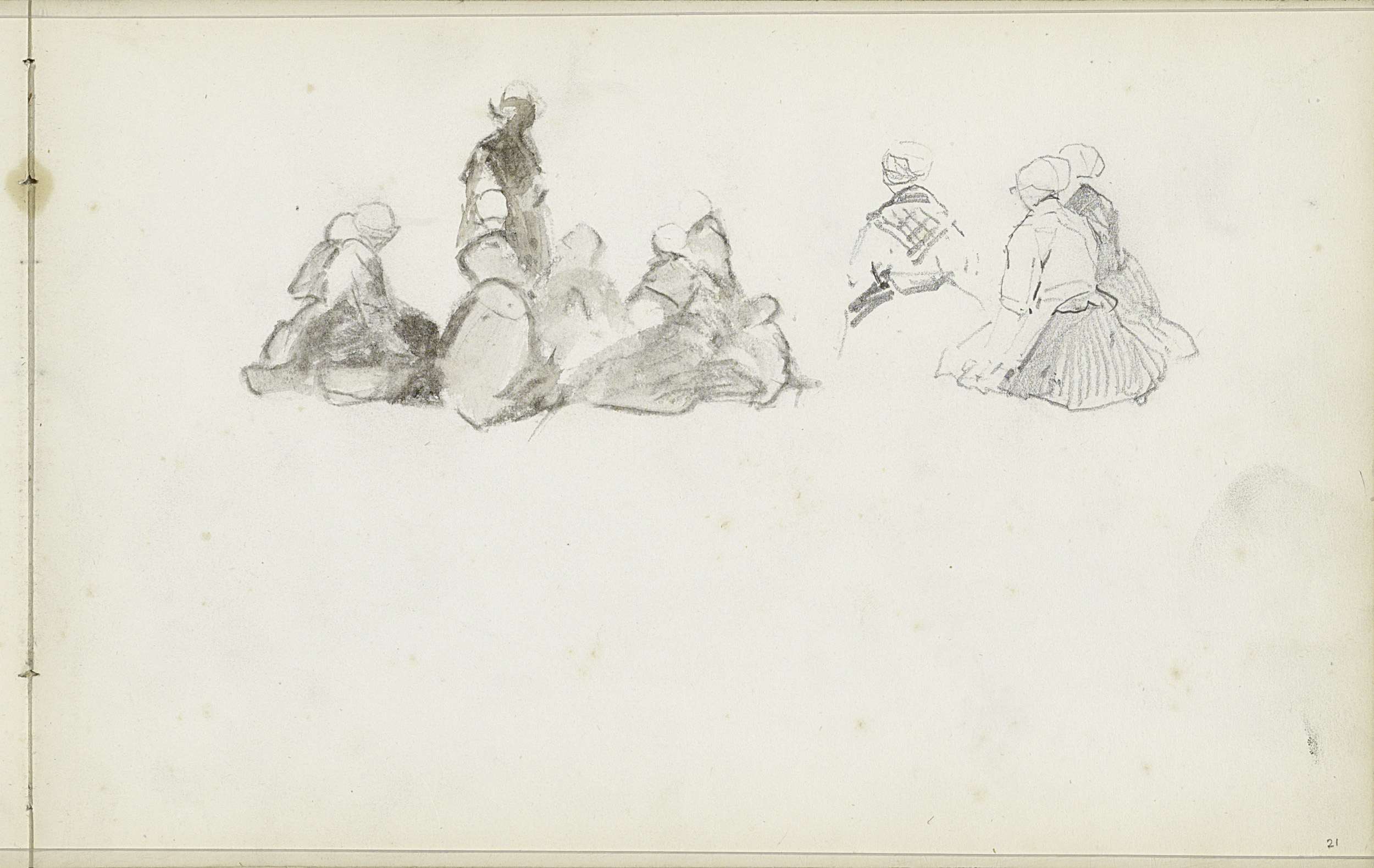 Groep zittende vrouwen in Scheveningse dracht