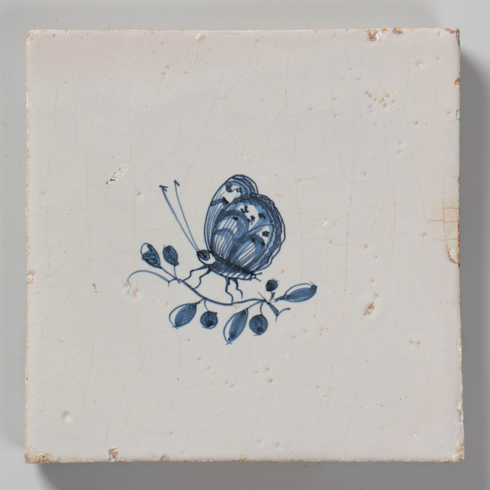 tegel van keramiek met tinglazuur, voorstellende: vl...