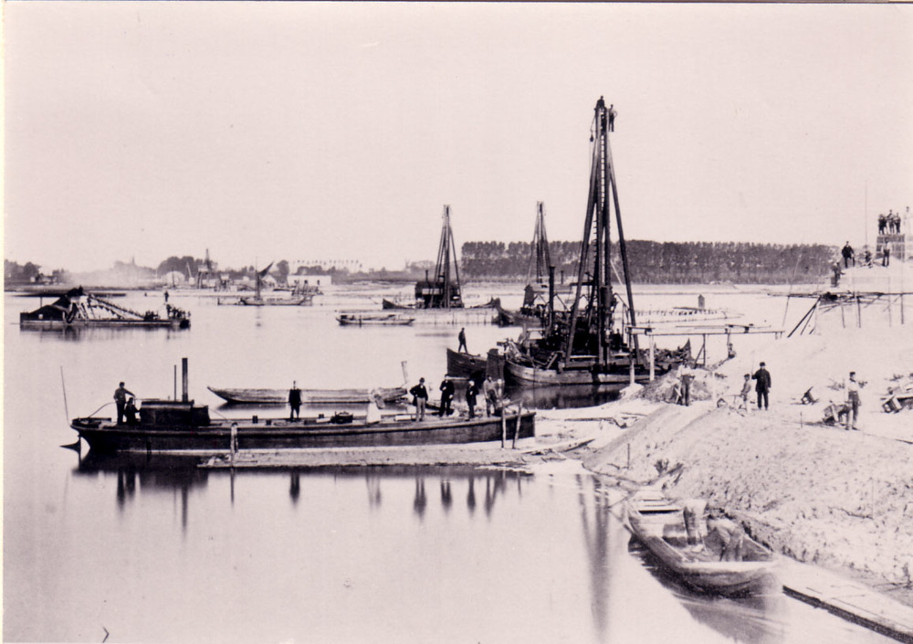Bouw spoorbrug over de waal bij Zaltbommel rond 1863.
