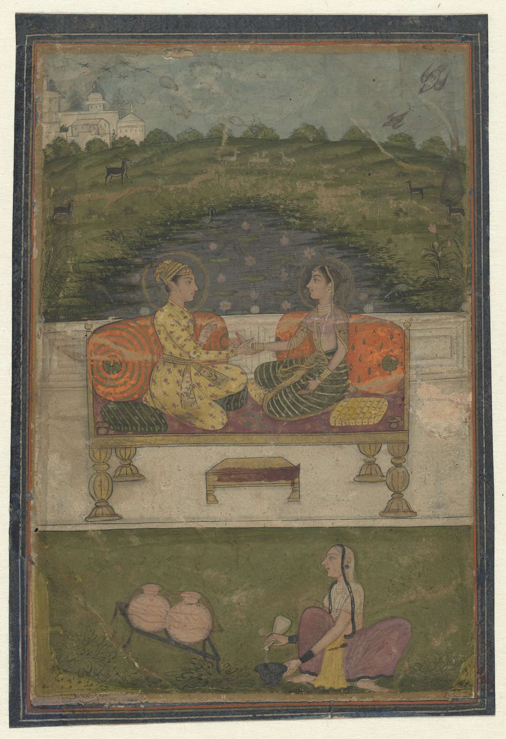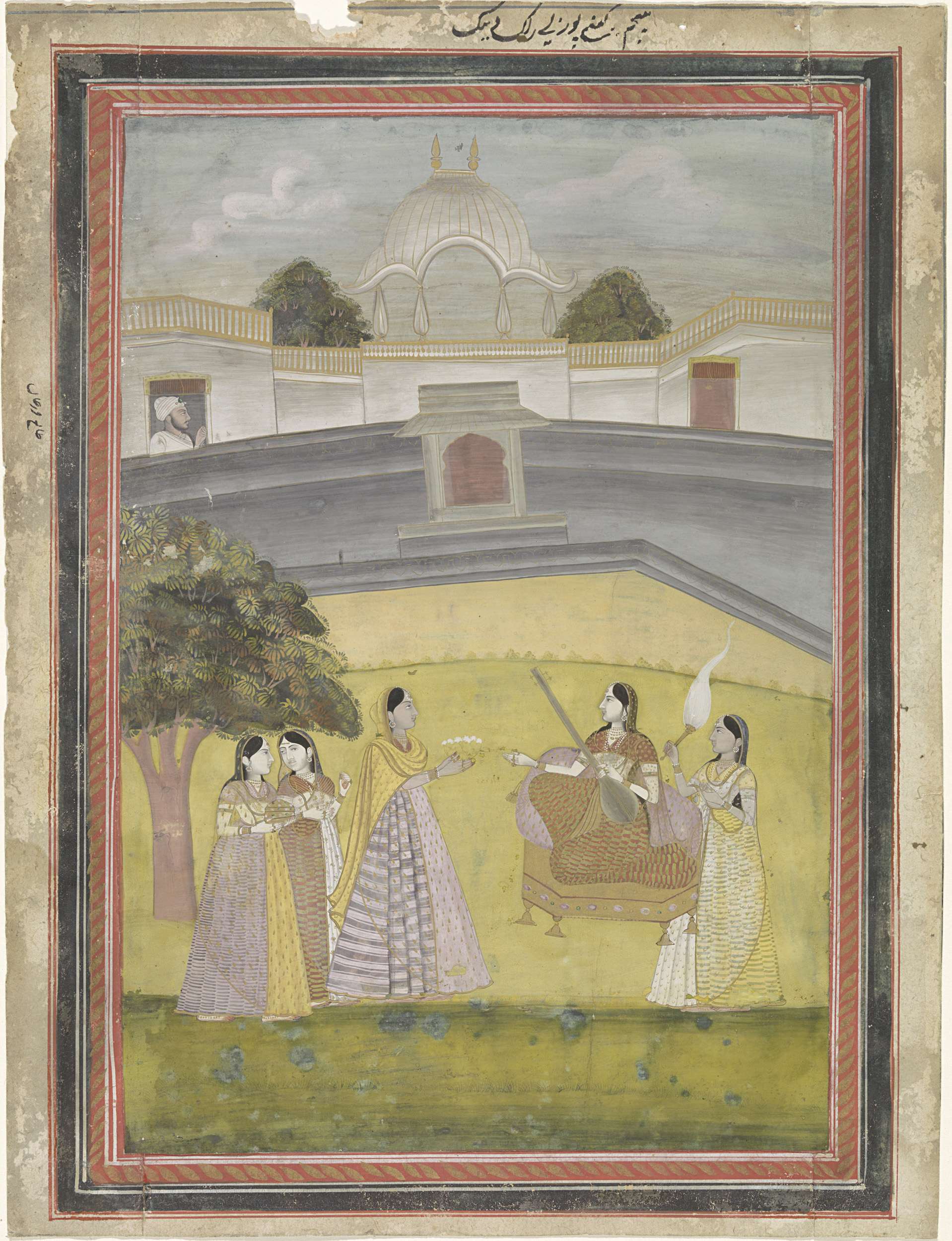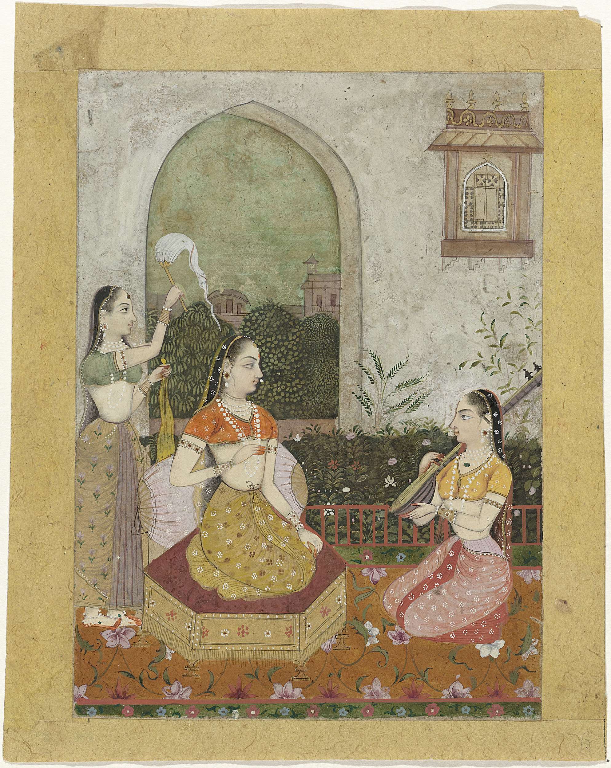 Vrouwen in een tuin voor een paleis