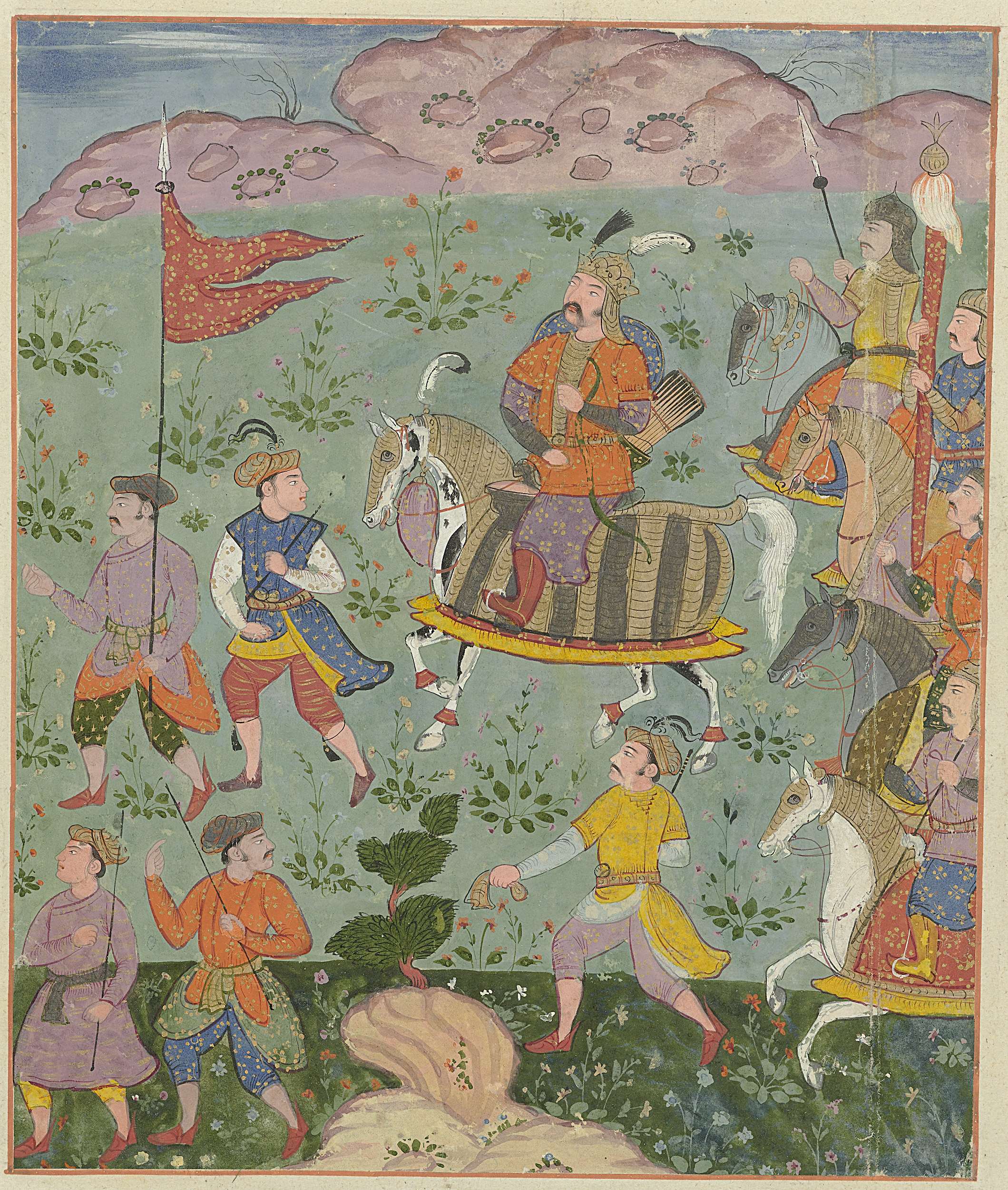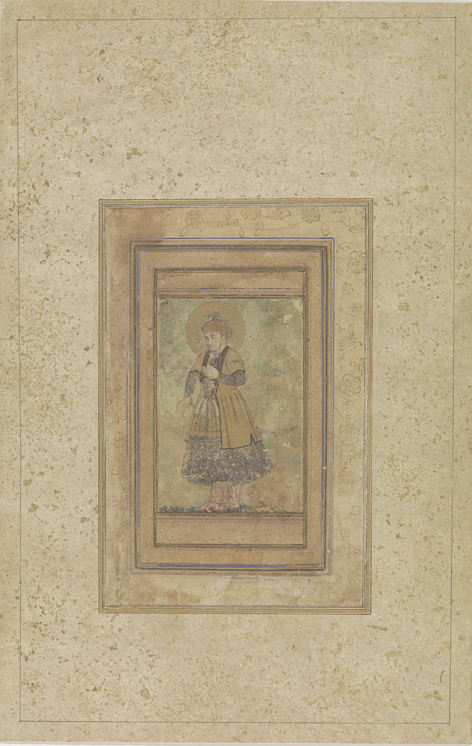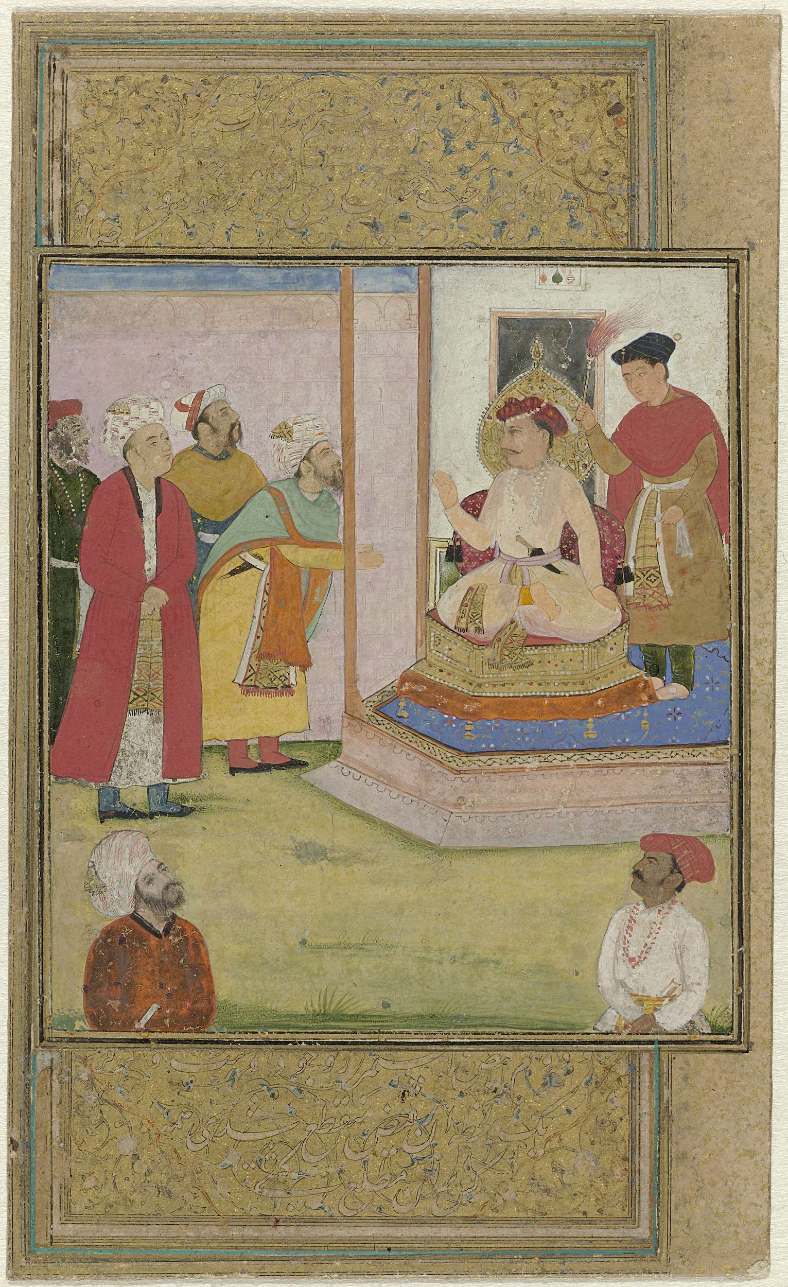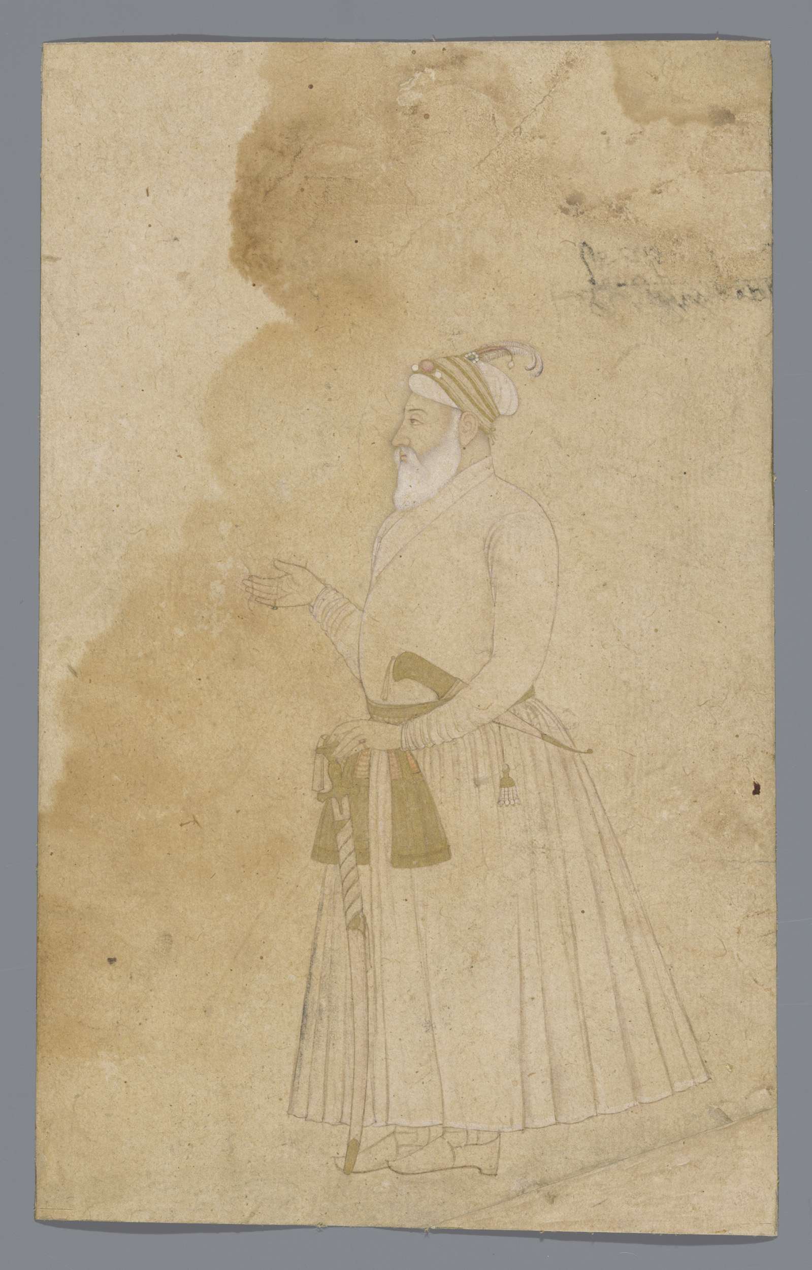 Portret van Akbar, staand, met verenpluim in de hand