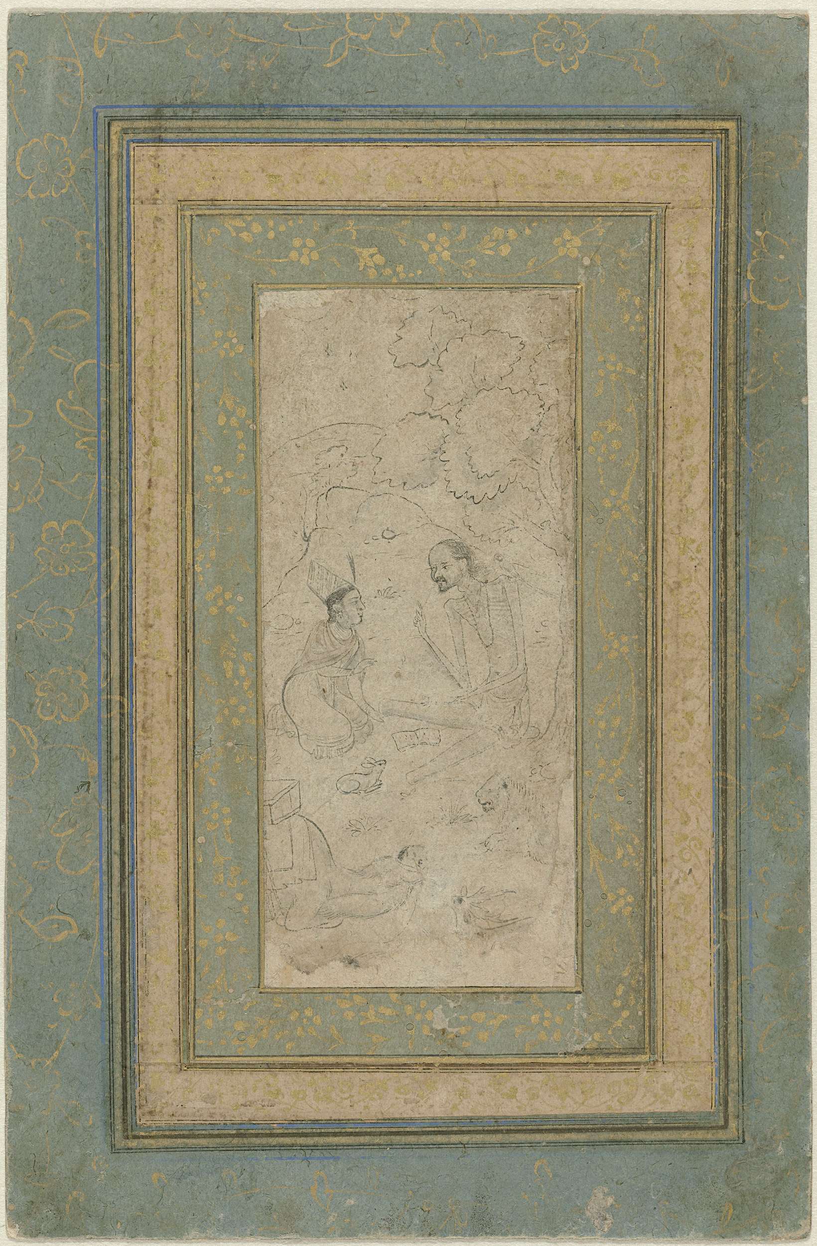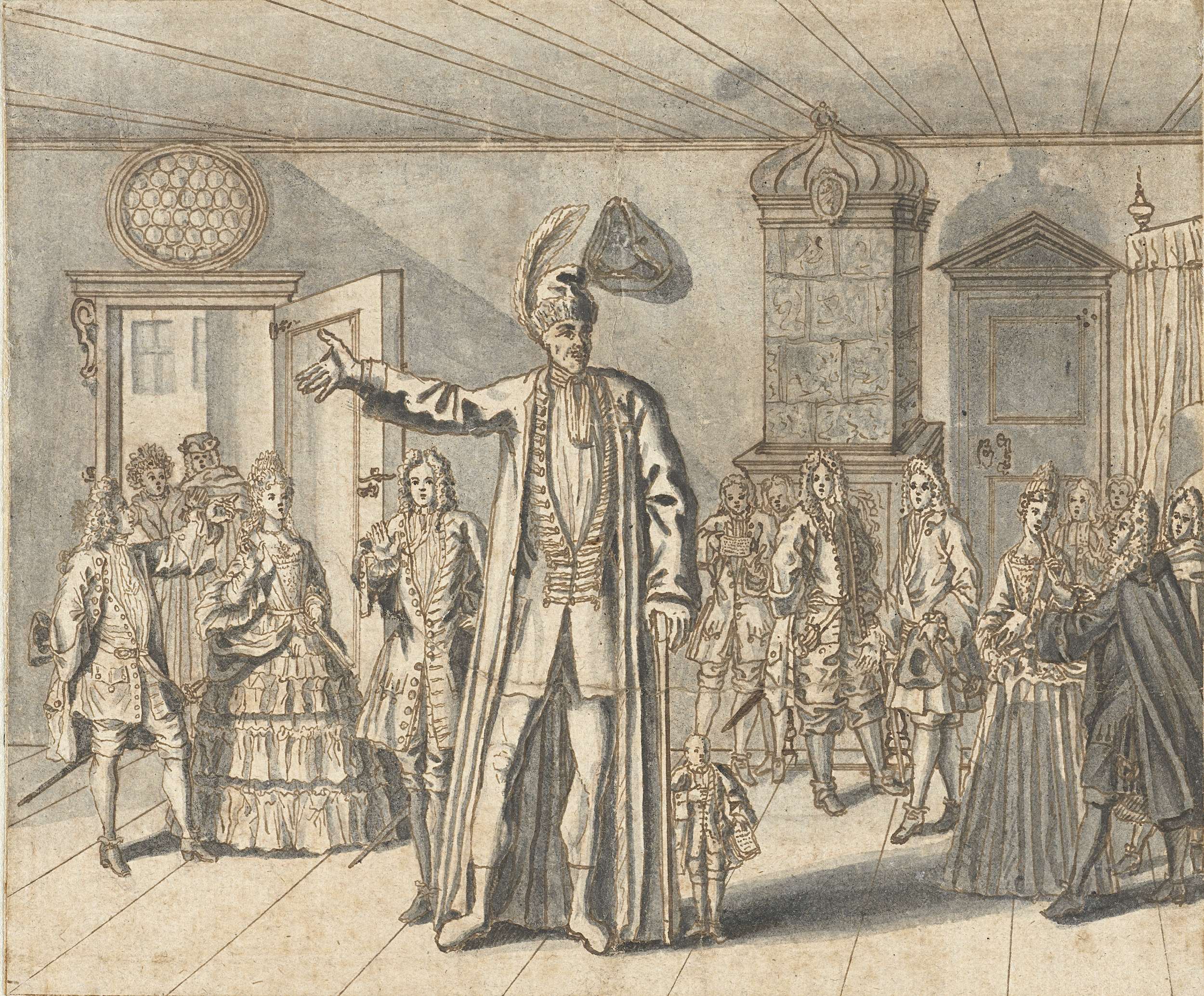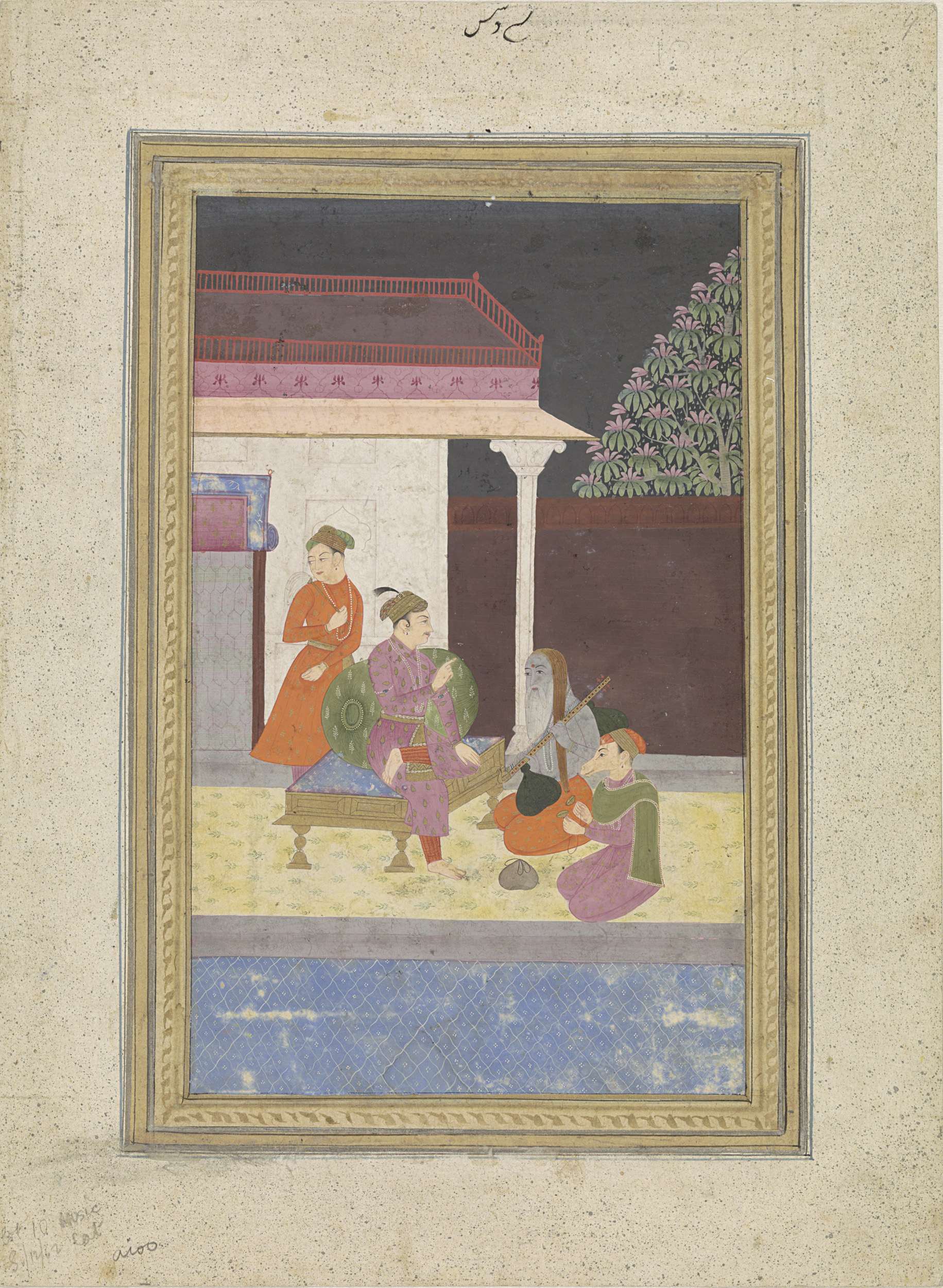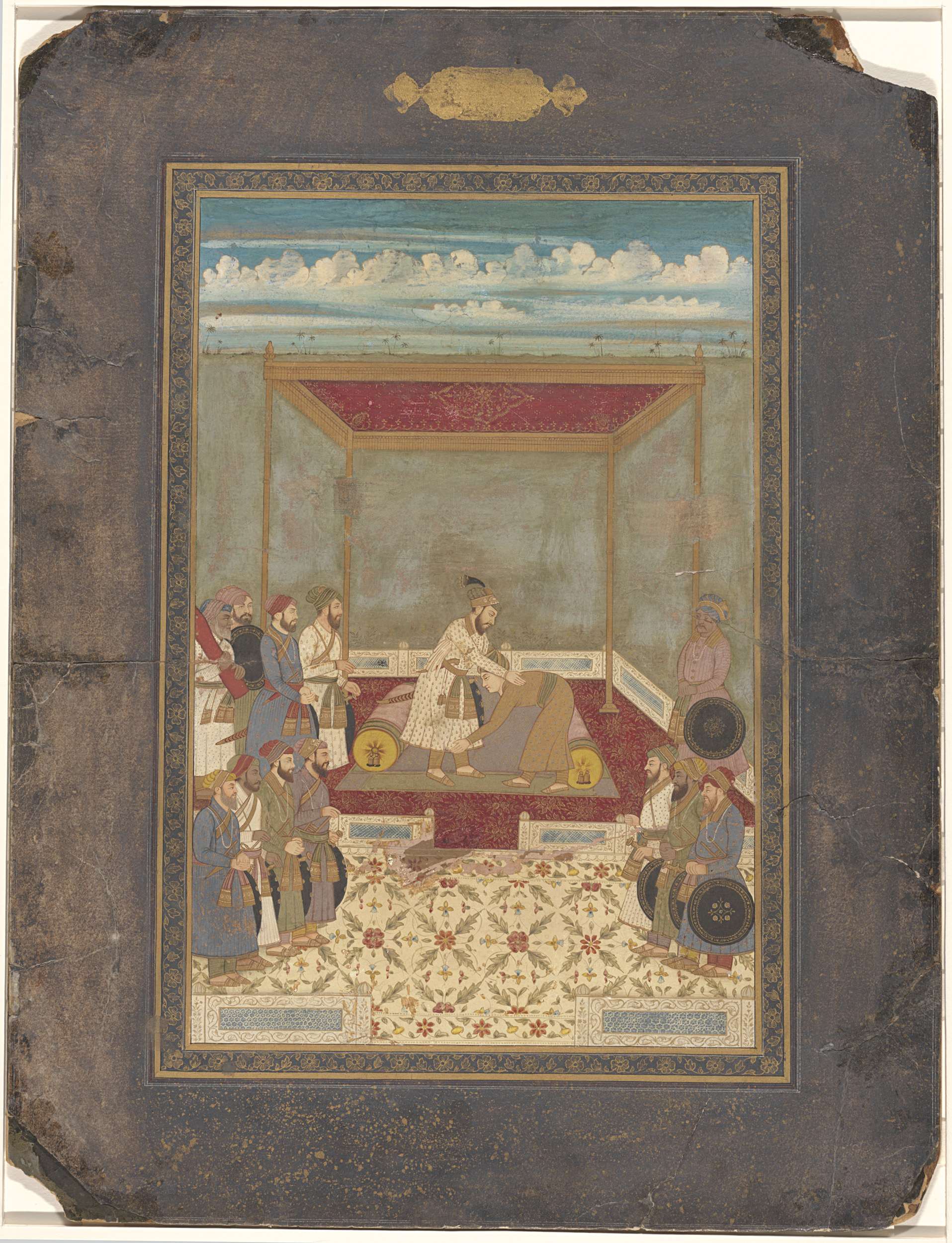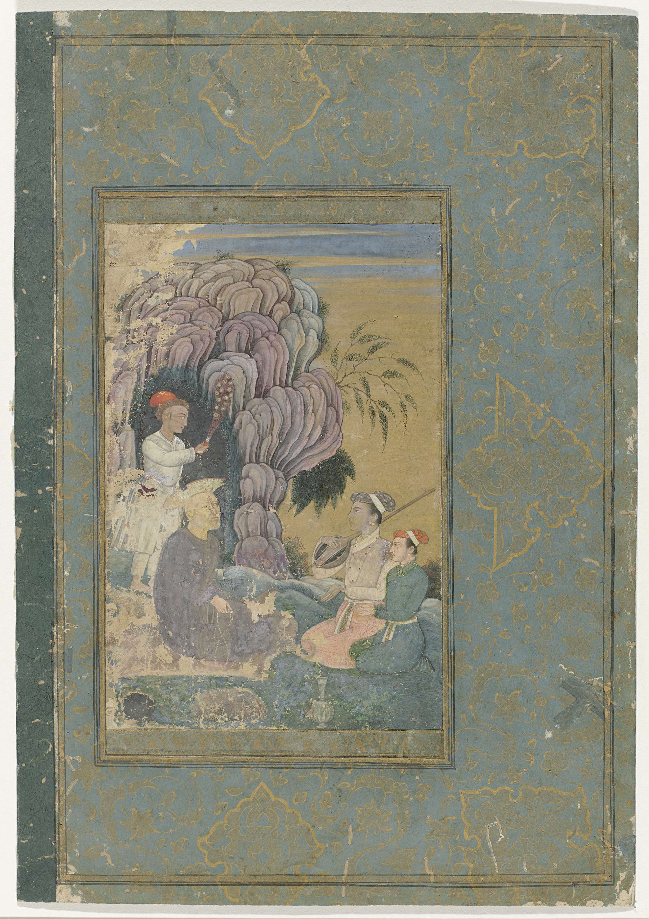 Portret van Akbar, staand, met verenpluim in de hand