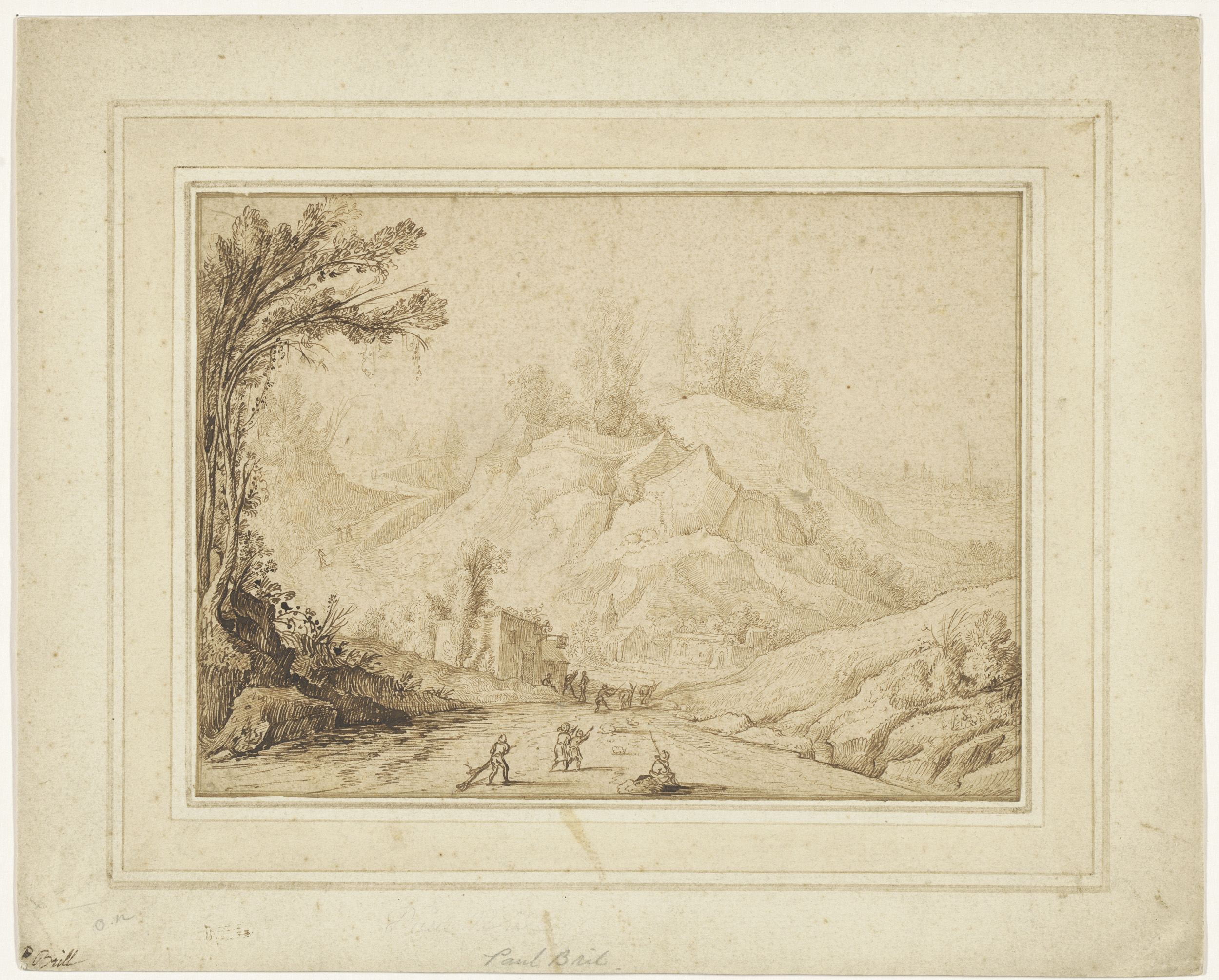 Berglandschap met figuren op een weg bij een herberg