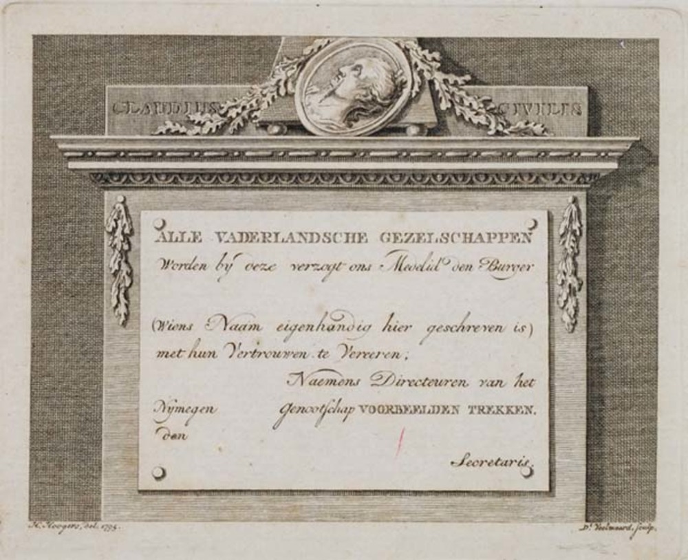 Prent met het Vaderlandsch Werpspel. Versieringen me...