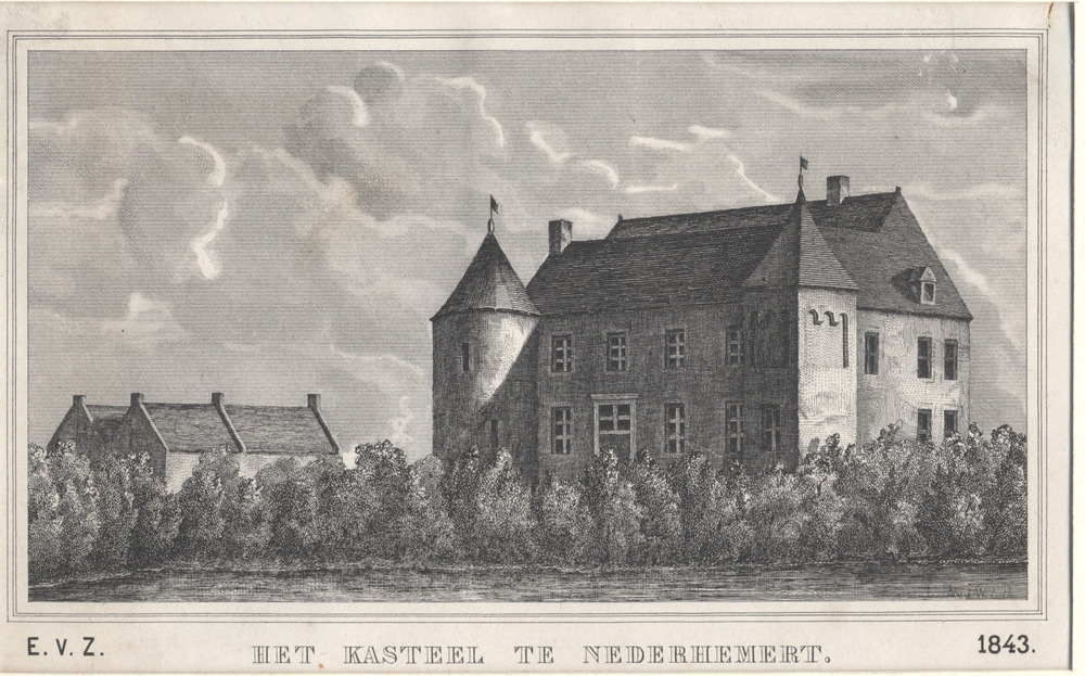Gezicht op het kasteel te Nederhemert. Dubbel gebouw...