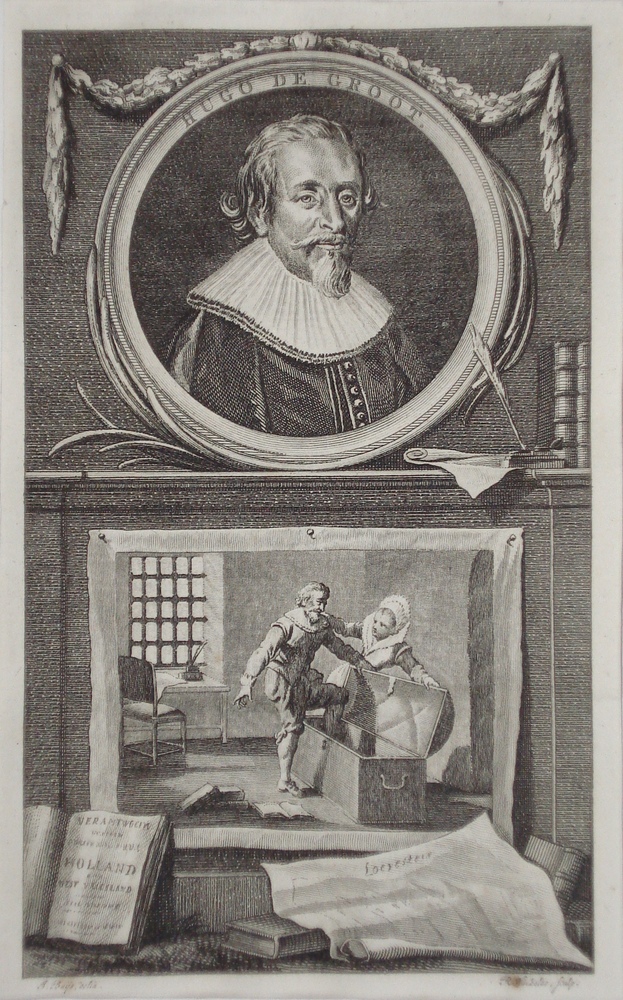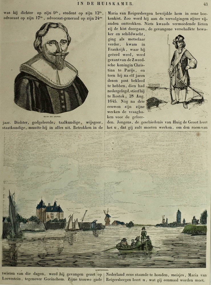 gezicht op Loevestein, met schildwacht en Hugo de Gr...