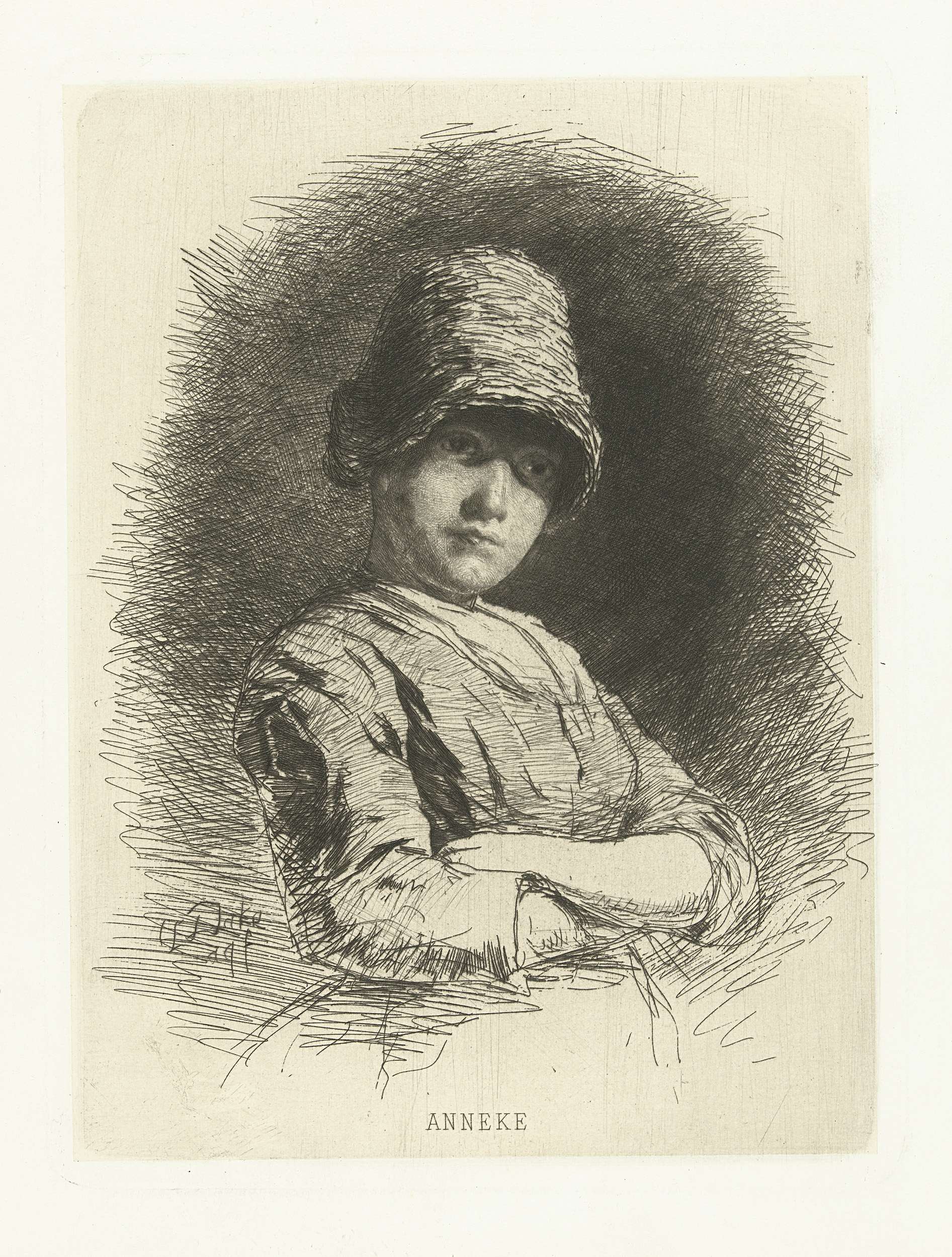 Portret van jonge vrouw, Anneke, staand met armen ov...