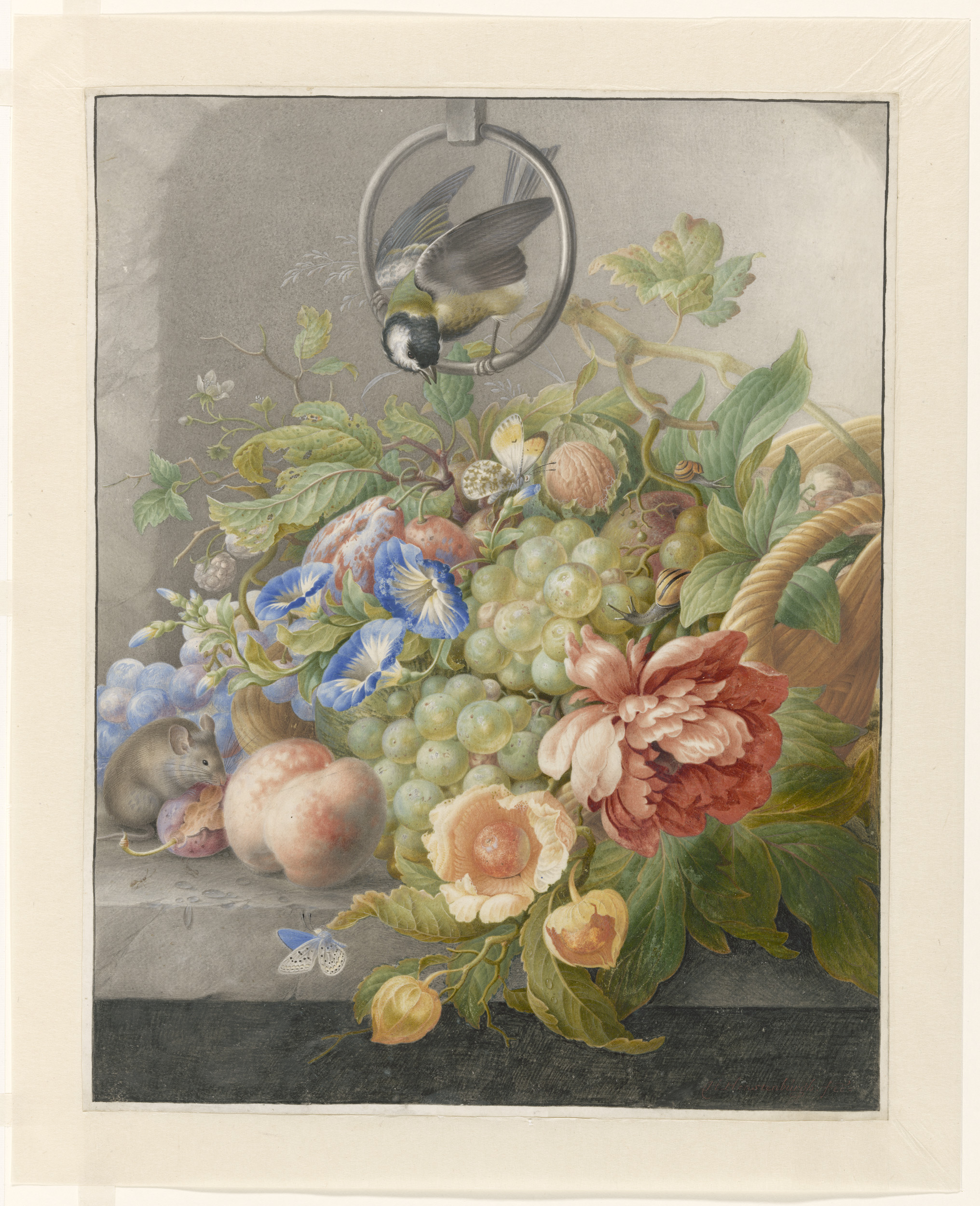 Stilleven met bloemen, vruchten, een koolmees en een...