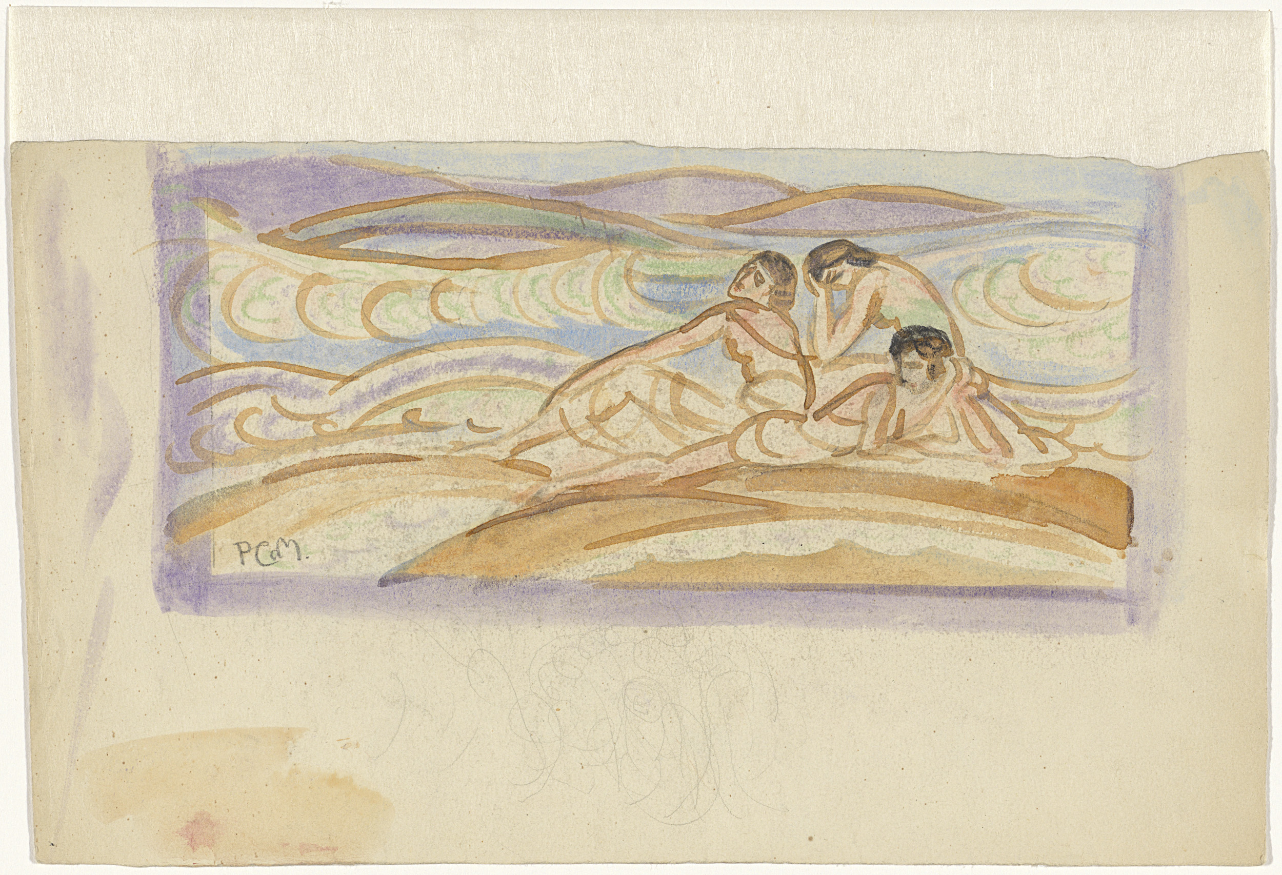 Drie vrouwelijke figuren bij de zee