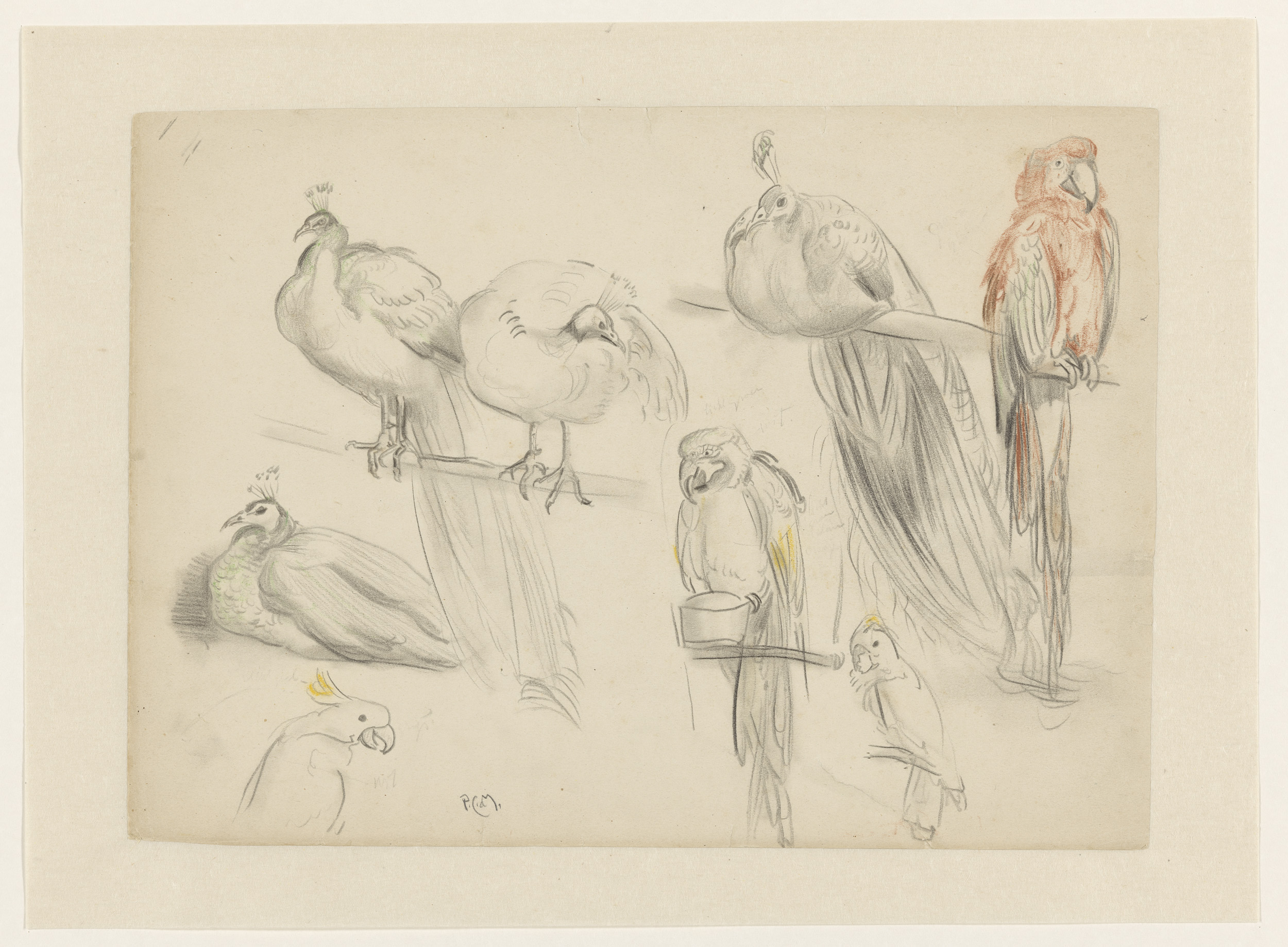 Schetsen van pauwen en papegaaien