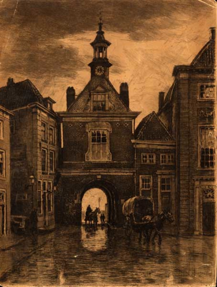 Gravure, voorstellende de Waterpoort te Tiel, gezien...