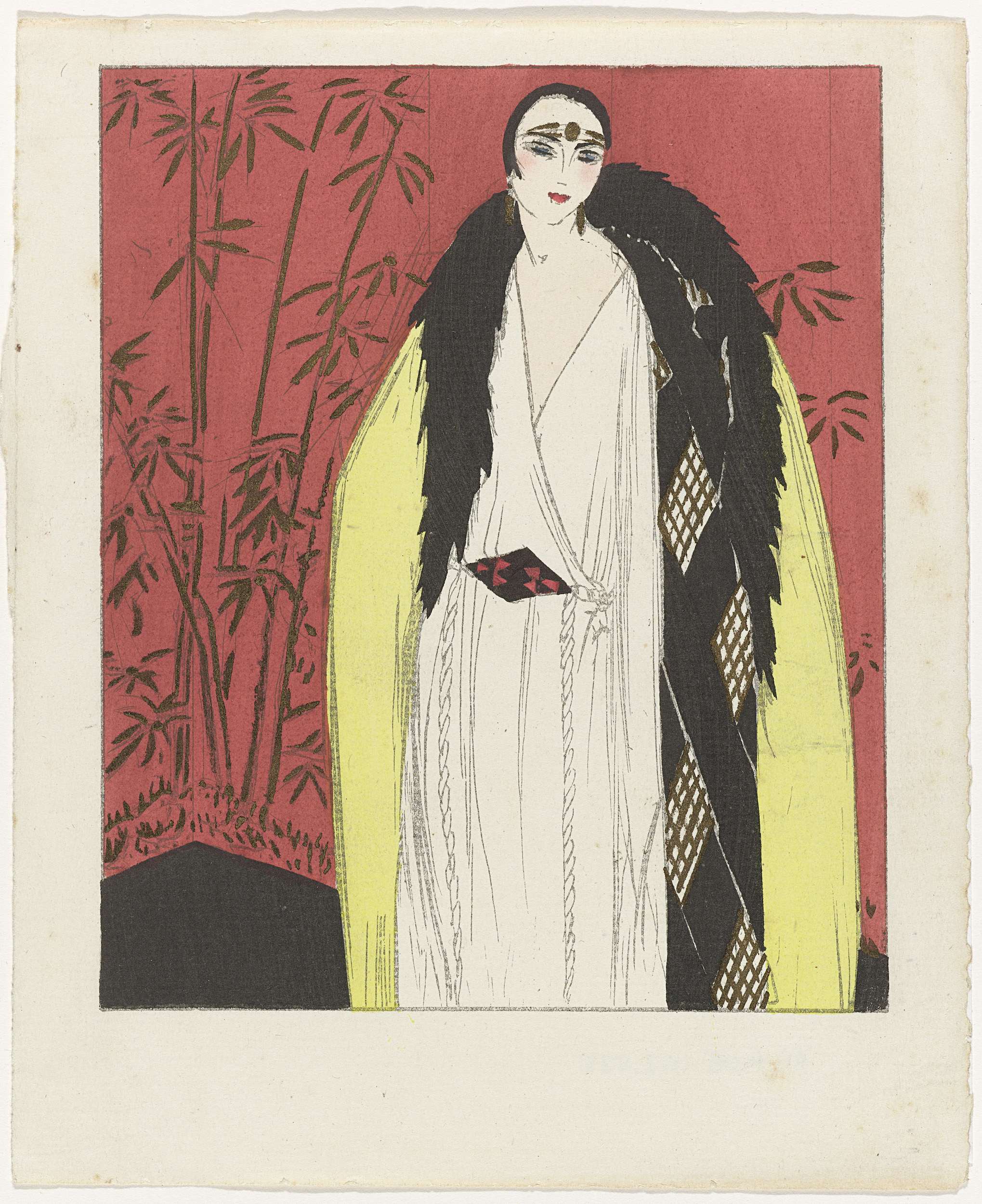 Vrouw in gele mantel afgezet met bont, ca. 1924