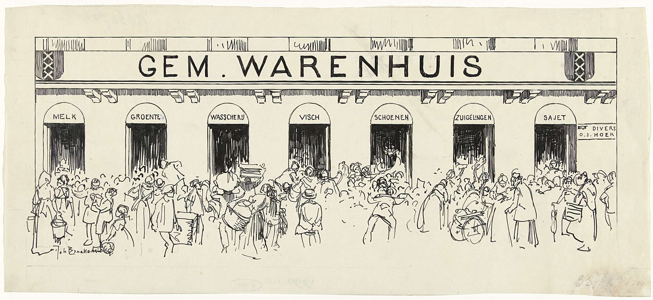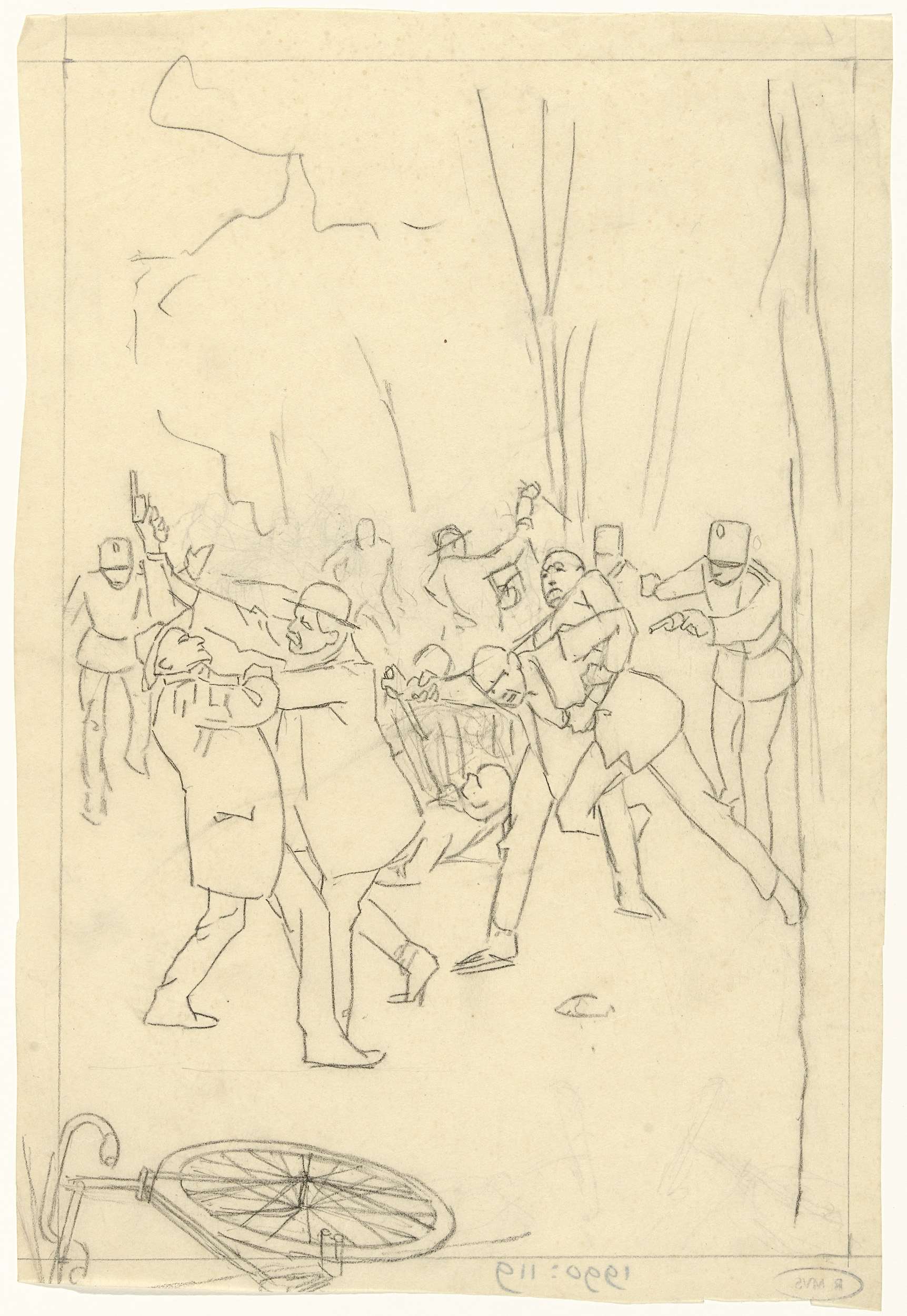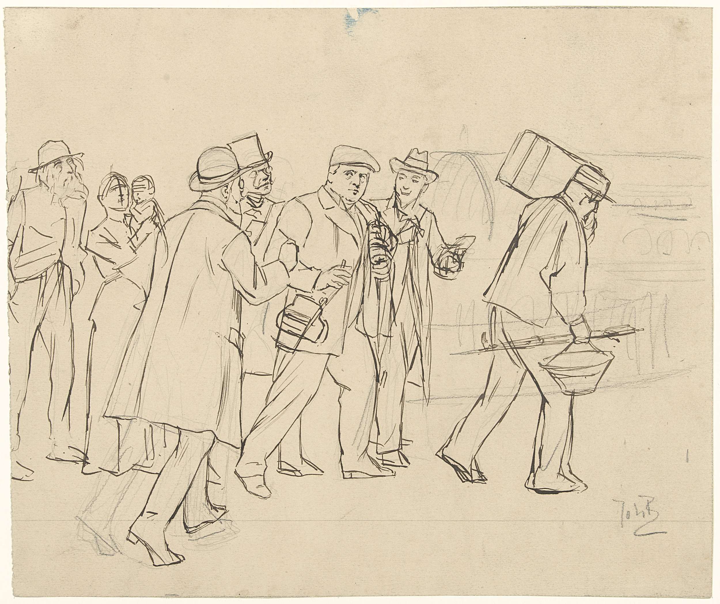 Ontwerp voor illustratie in De Amsterdammer: drommen...