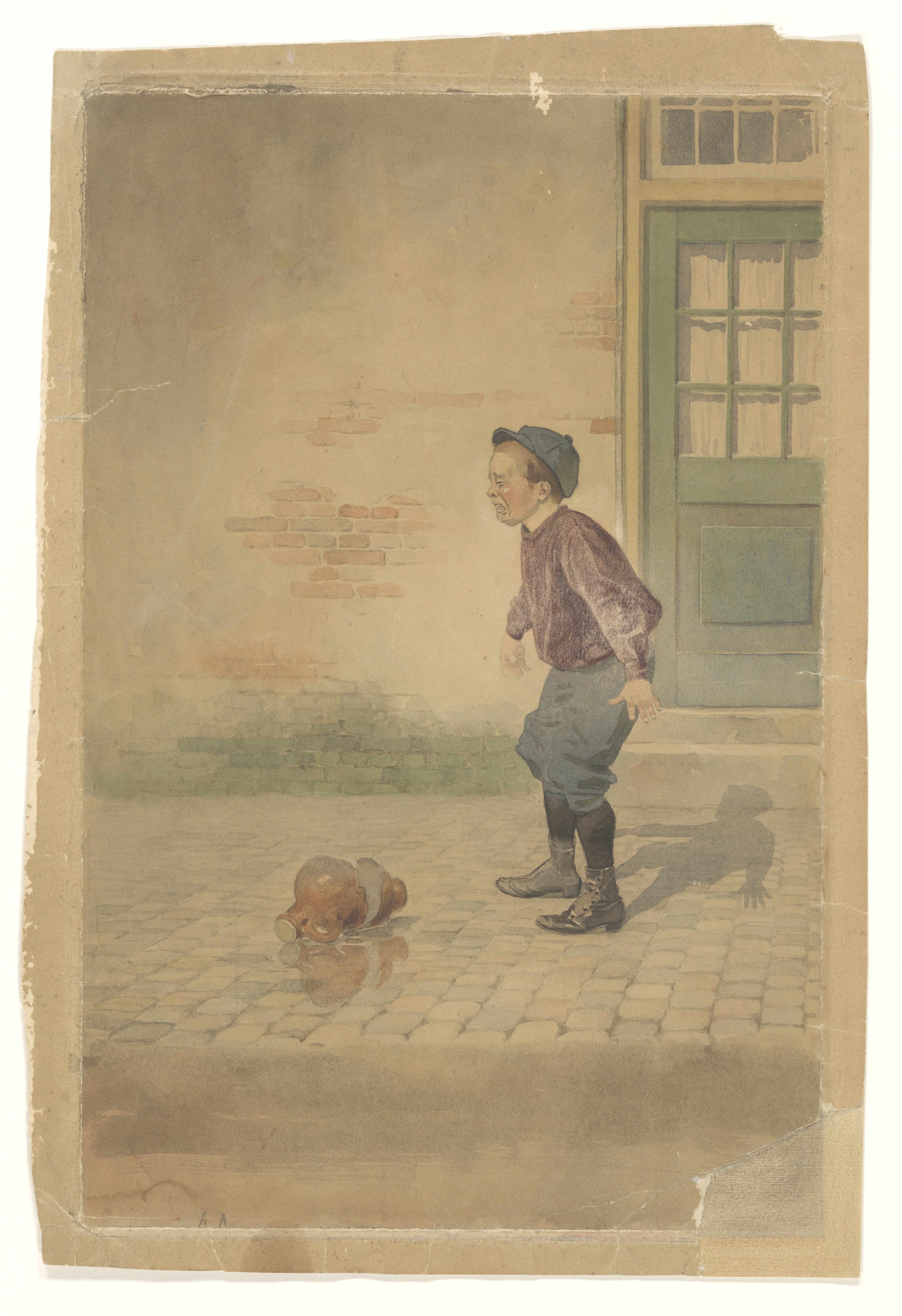 Huilend jongetje bij gebroken kruik