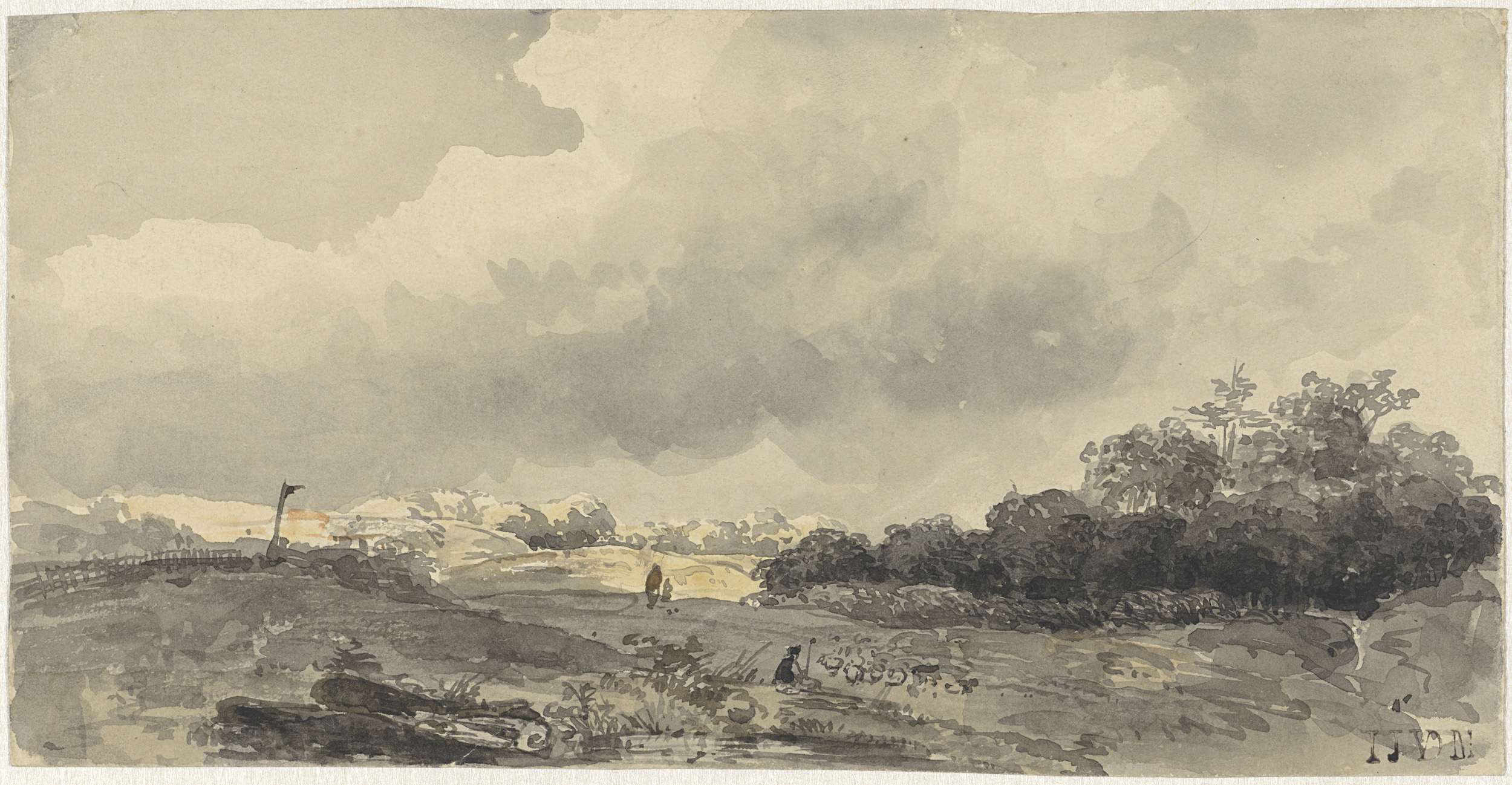 Landschap met schaapherder onder zware wolkenlucht