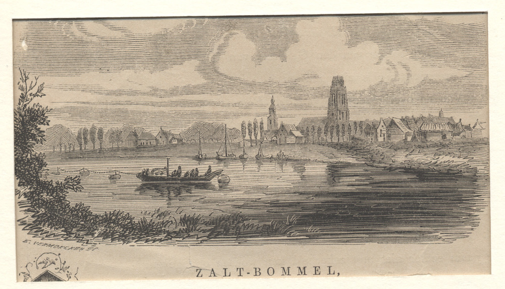 gezicht op de stad Zaltbommel vanaf het water. Gravu...
