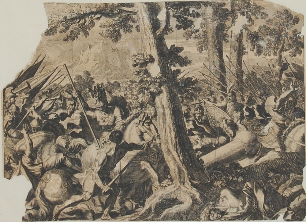 Gezicht op gevechtsscène in bosrijke omgeving. Koper...