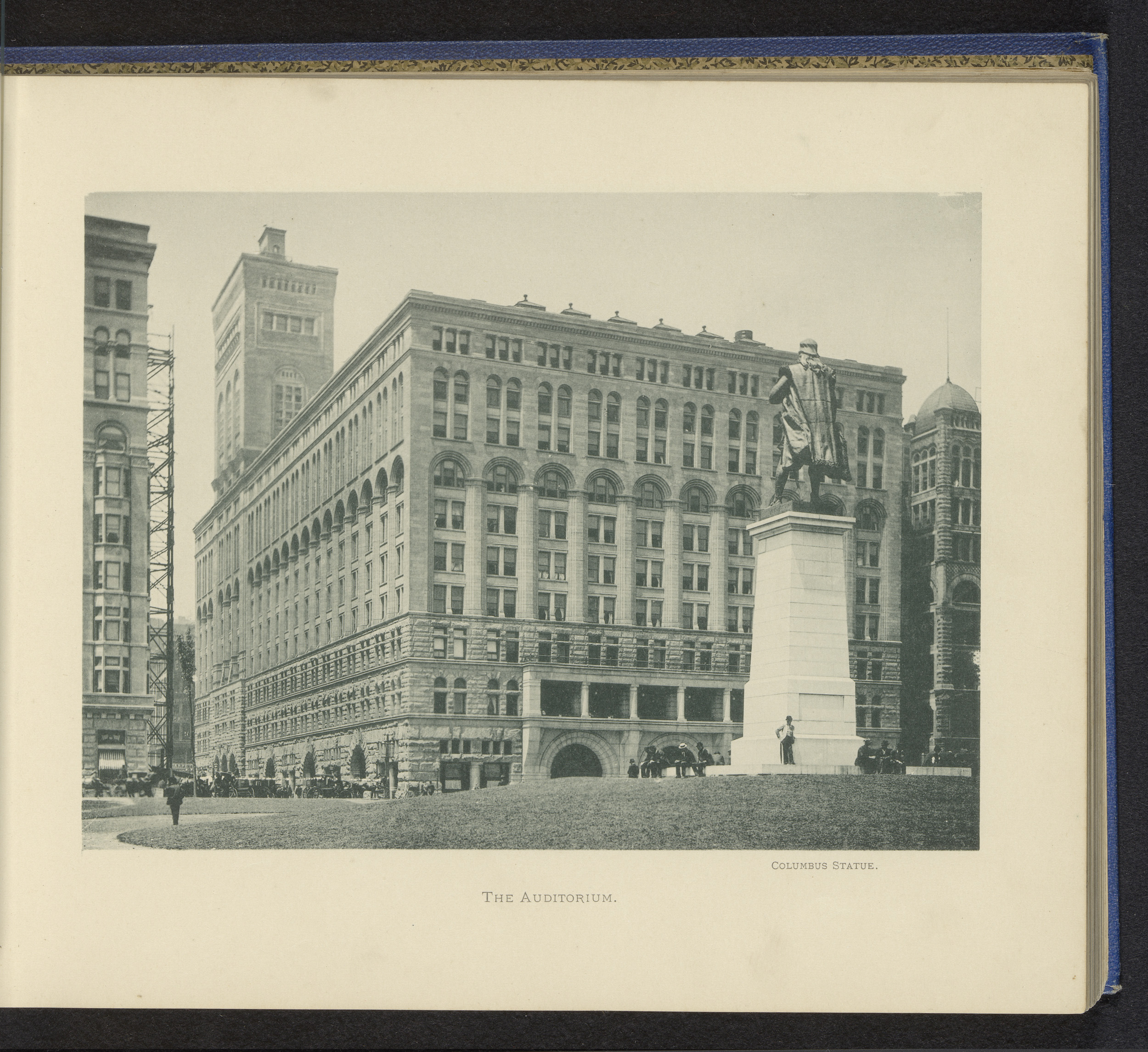 Gezicht op het Auditorium hotel en een standbeeld va...