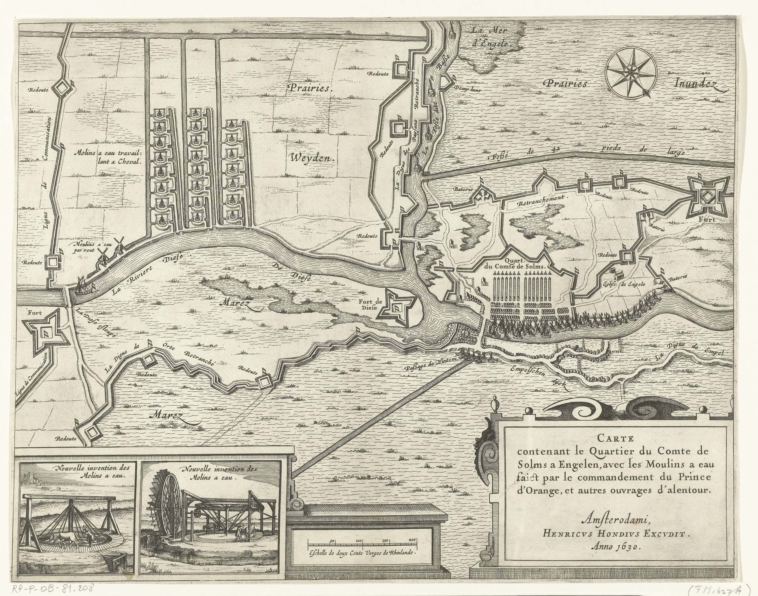 Kaart met de watermolens en het legerkwartier van de...