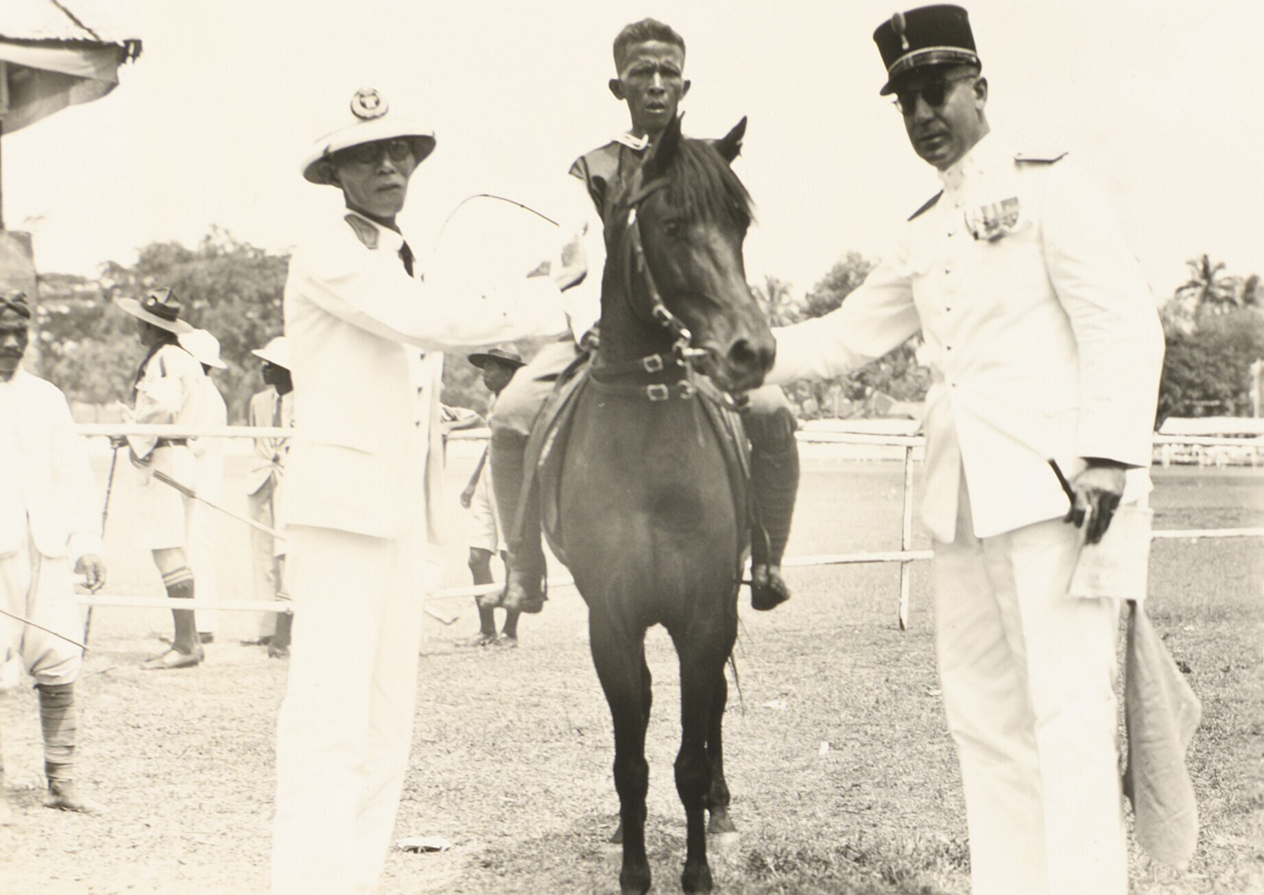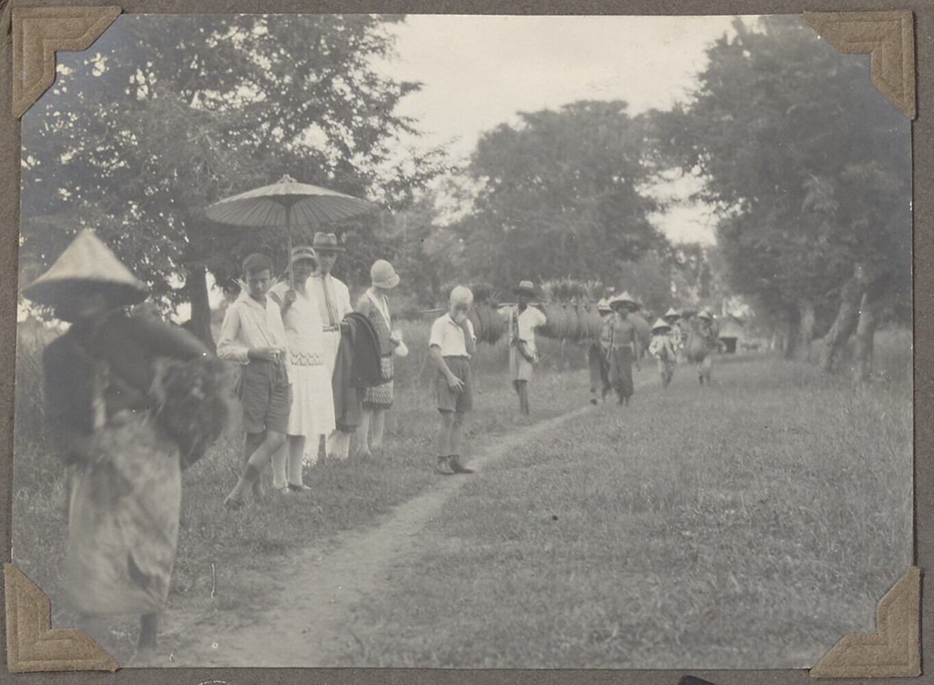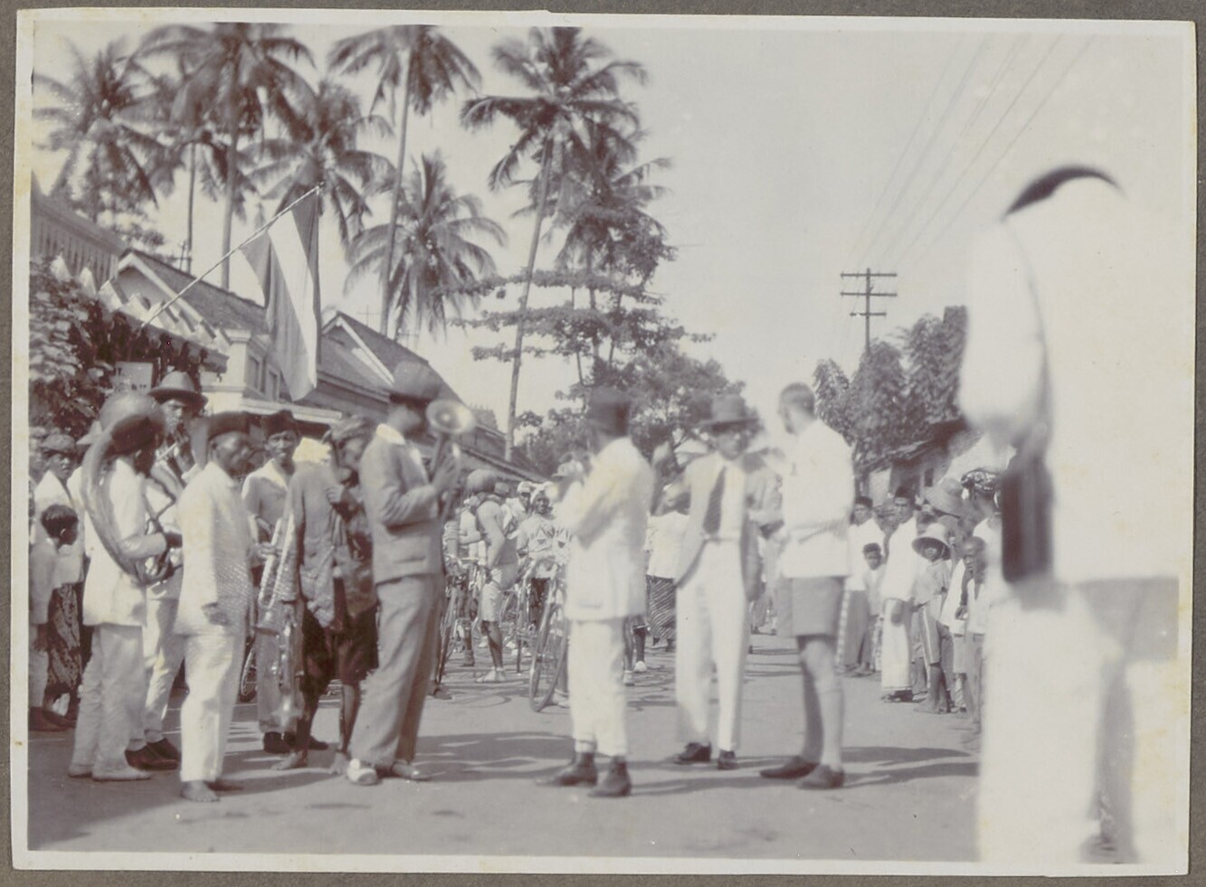 Groep Europese en Javaanse mannen tijdens optocht na...