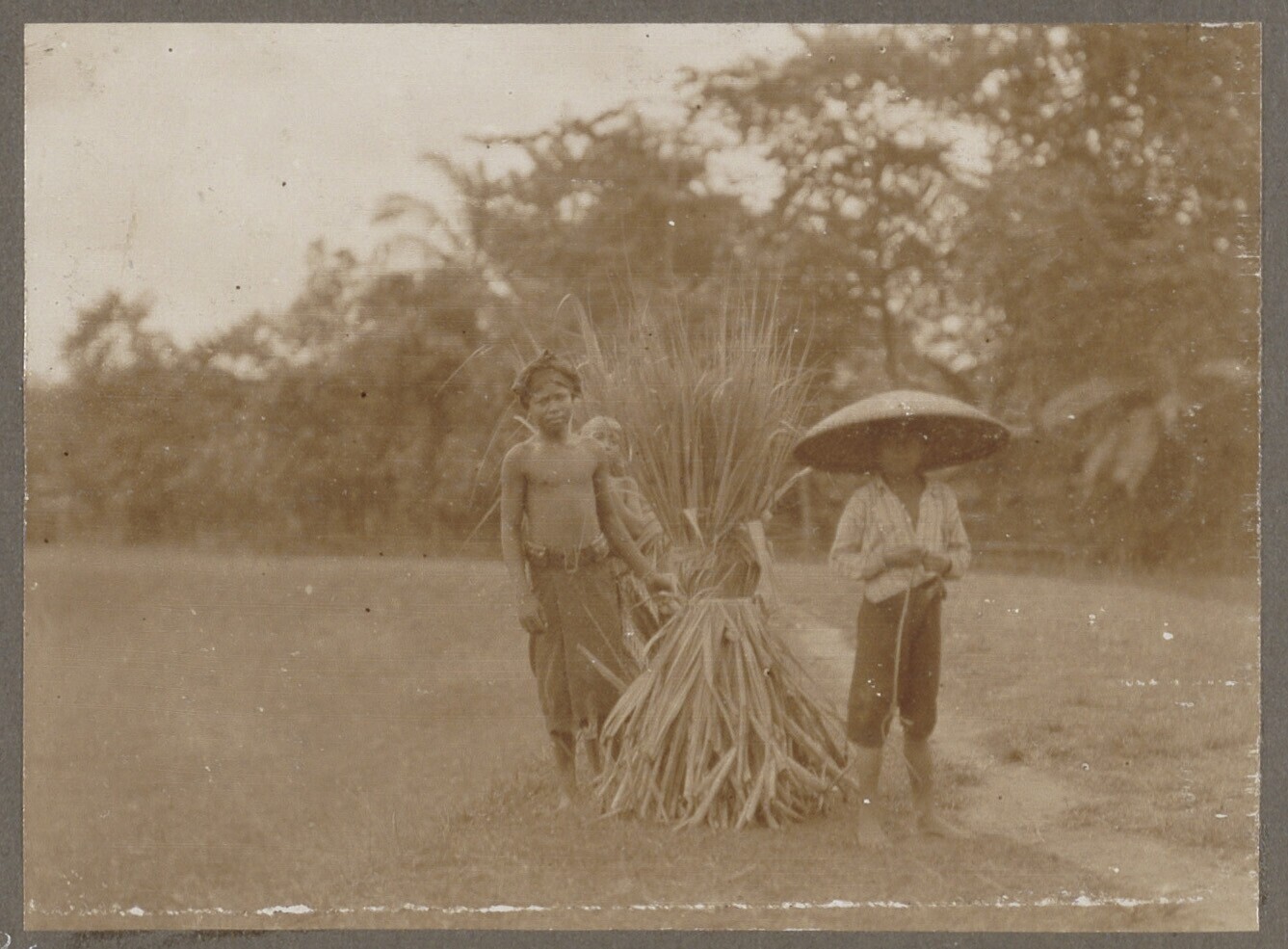 Javaanse kinderen met hoed en bij elkaar gebonden gewas