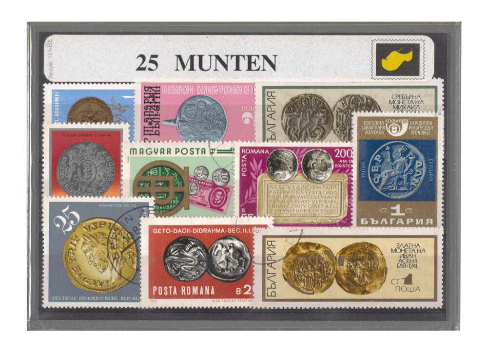 Zesentwintig postzegels met muntafbeeldingen, verpak...