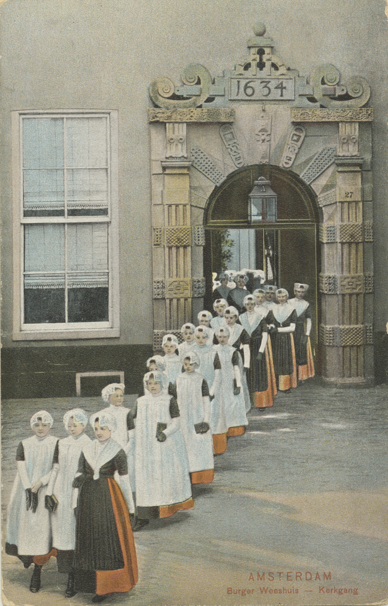 Prentbriefkaart van het Burgerweeshuis - 'Kerkgang'
