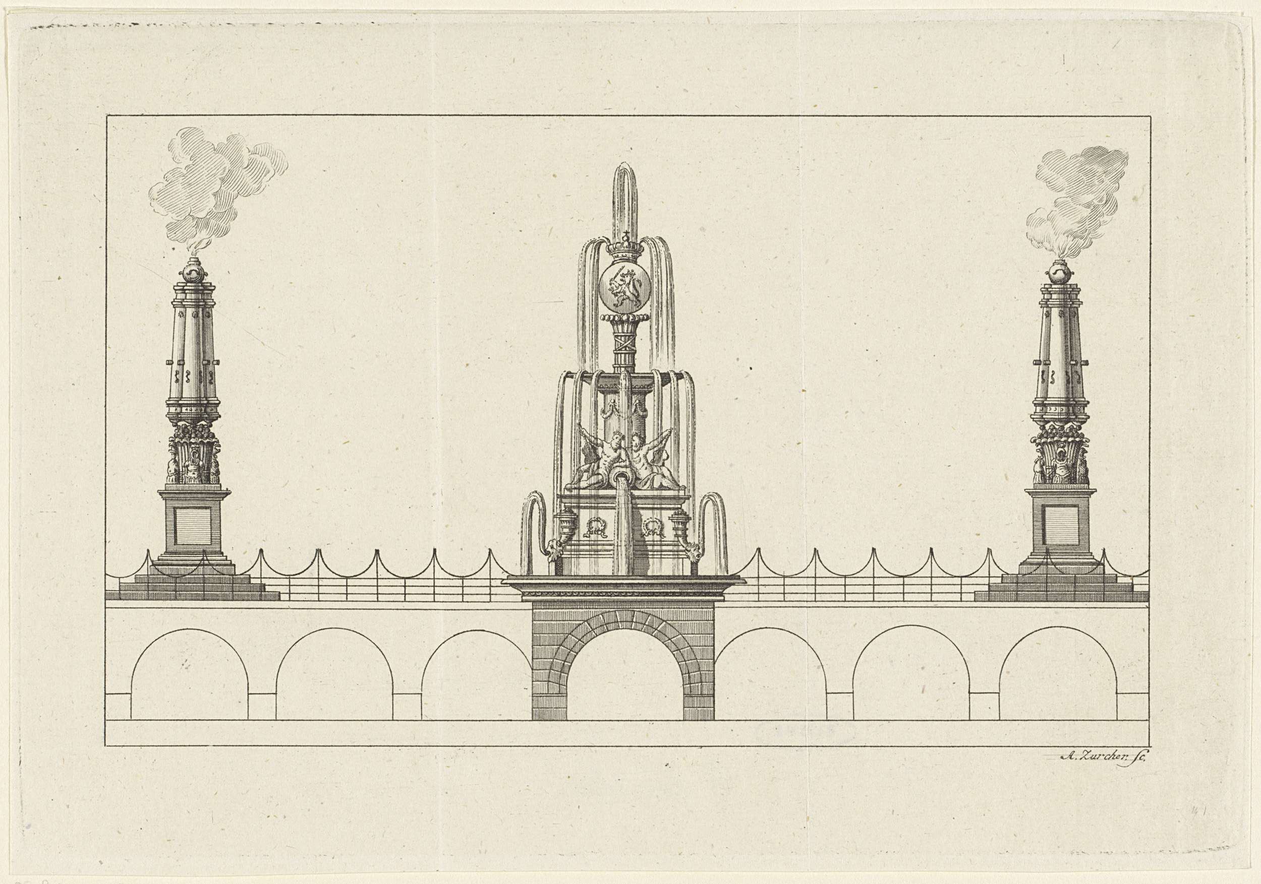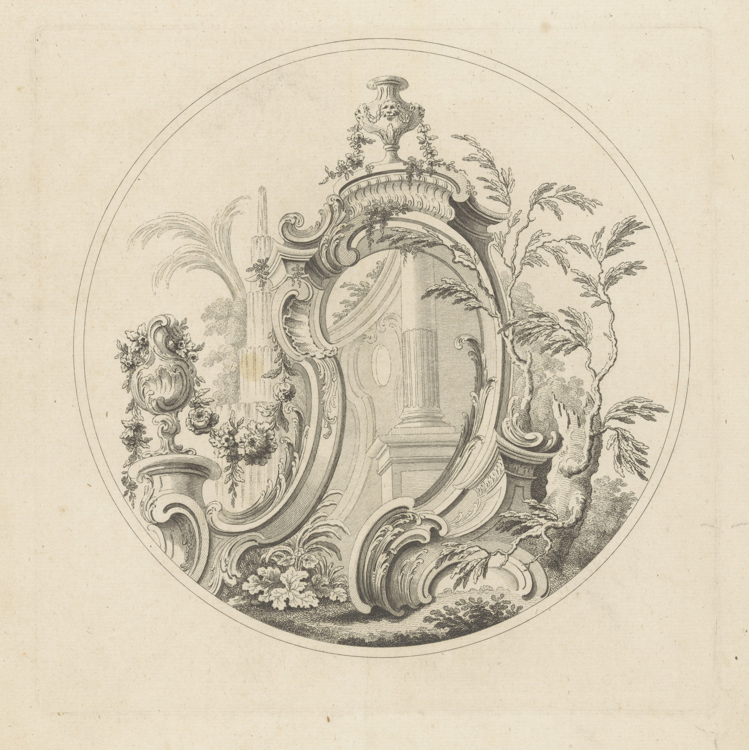 Cartouche in landschap met fonteinen
