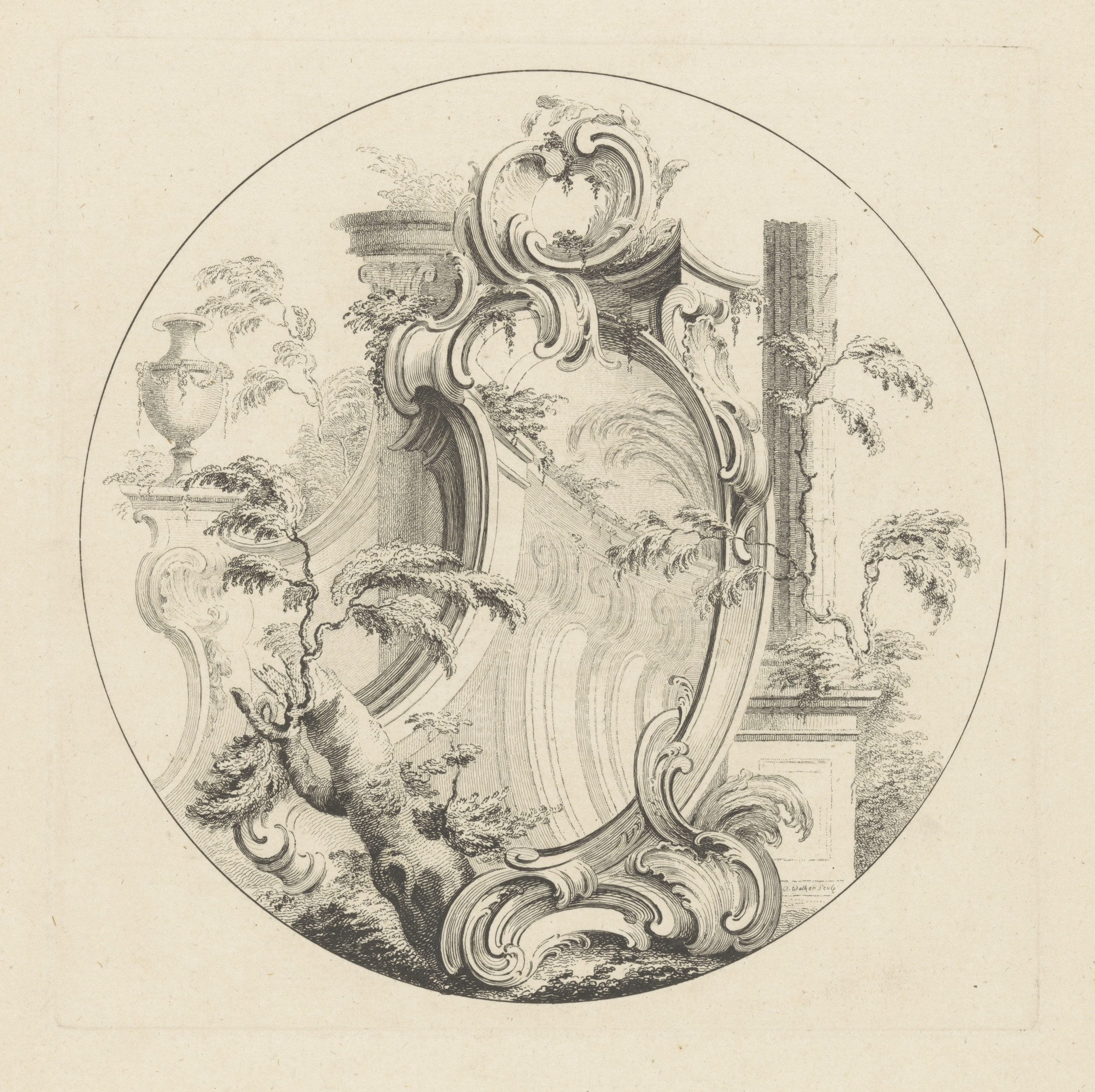 Cartouche in landschap met colonnades