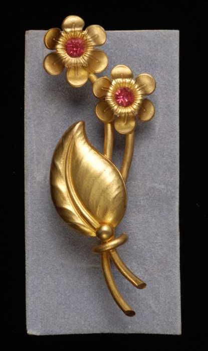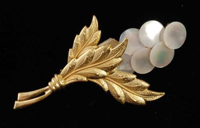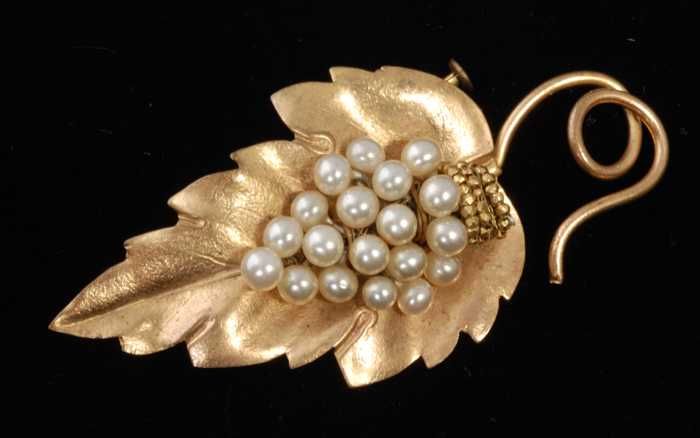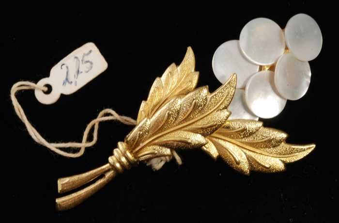 Broche, drie goudkleurige metalen blaadjes en een tr...