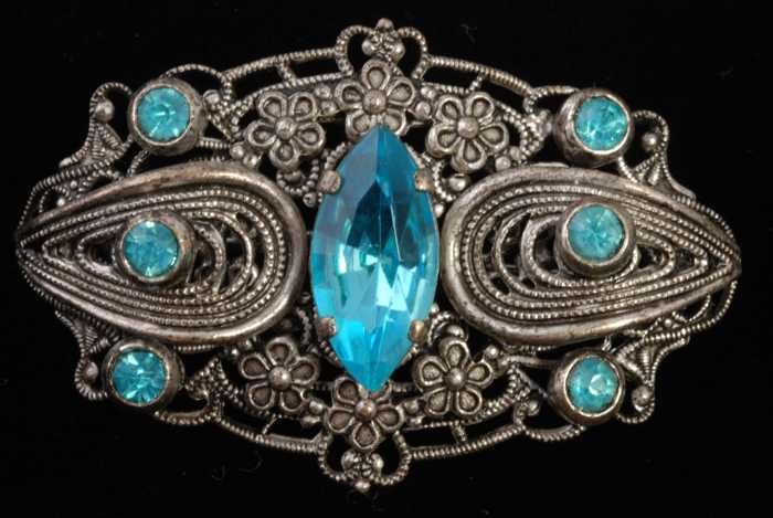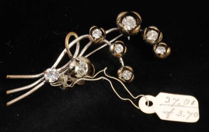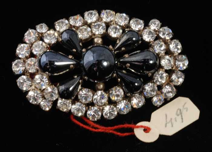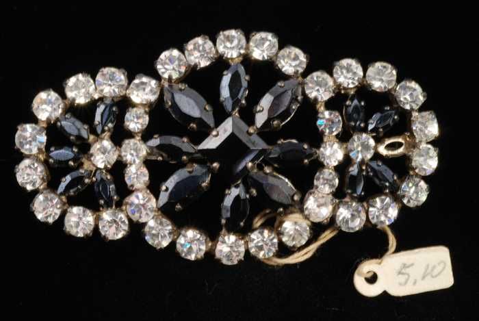 Ovale broche met veel kunstdiamantjes in een zilverk...
