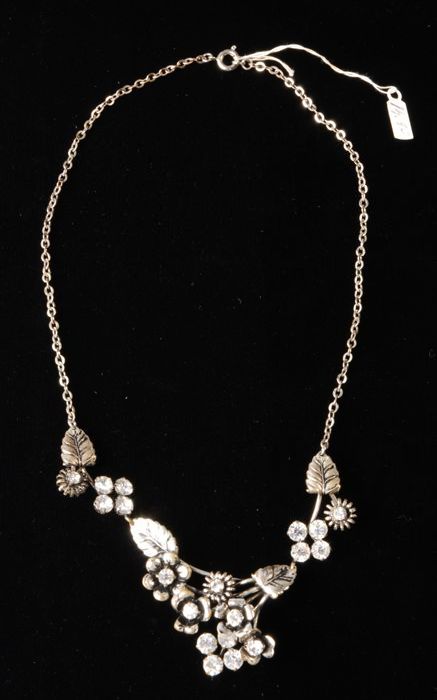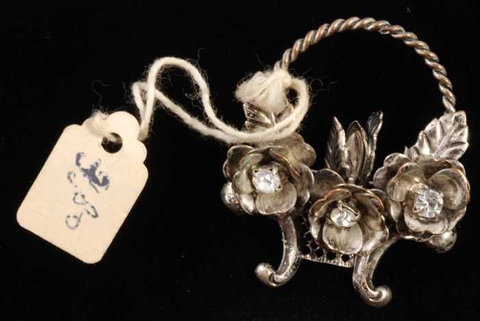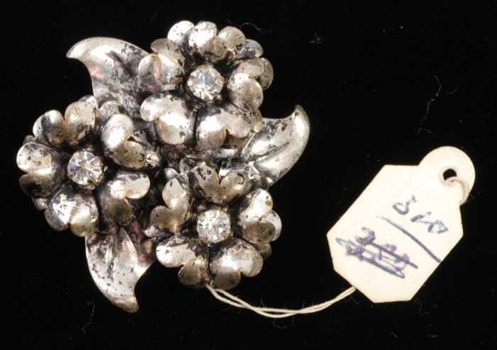Broche, zilverkleurig metaal met bloemvormpjes met k...