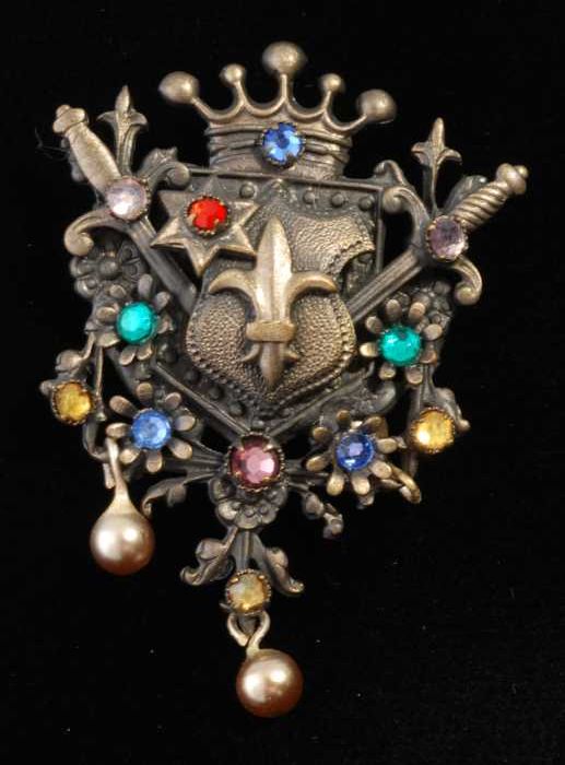 Broche, gekroond wapenschild van donker metaal met g...