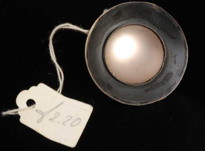 Broche van donker metaal, schotelvormig met een matt...