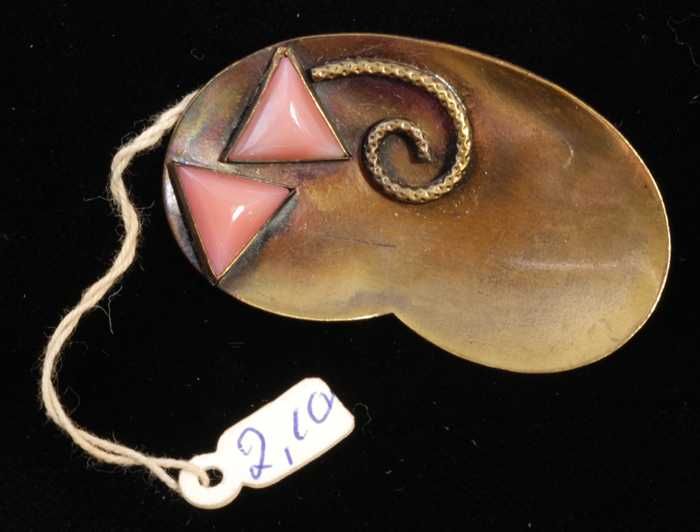 Broche van donker metaal, paletvorm met twee roze en...