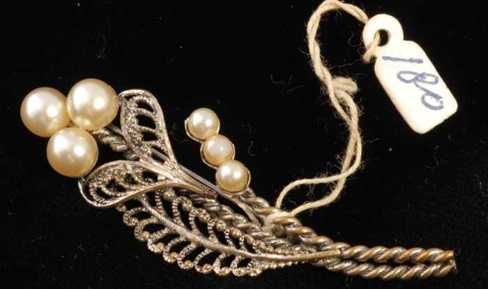 Broche, takje van zilverkleurig filigrein metaal met...