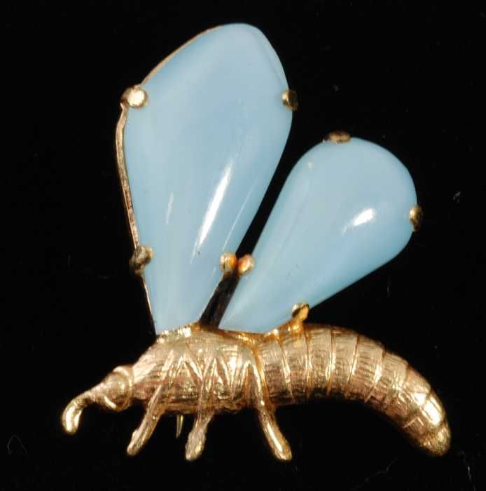 Broche van goudkleurig metaal en lichtblauw glas in ...