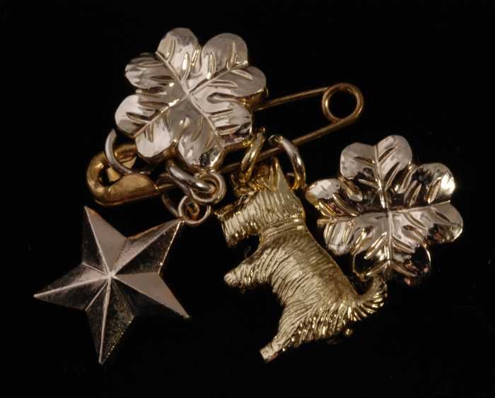 Broche, kleine goudkleurige veiligheidsspeld met vie...