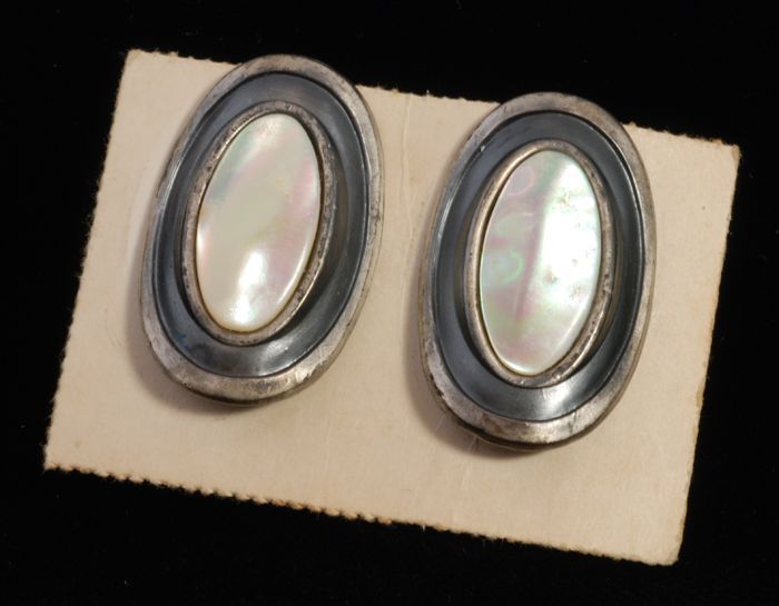 Paar oorbellen, ovale gebogen clips met paarlemoeren...