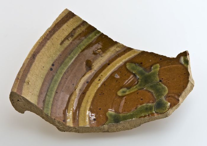 Fragment klein aardewerk bord of bak, versierd met p...