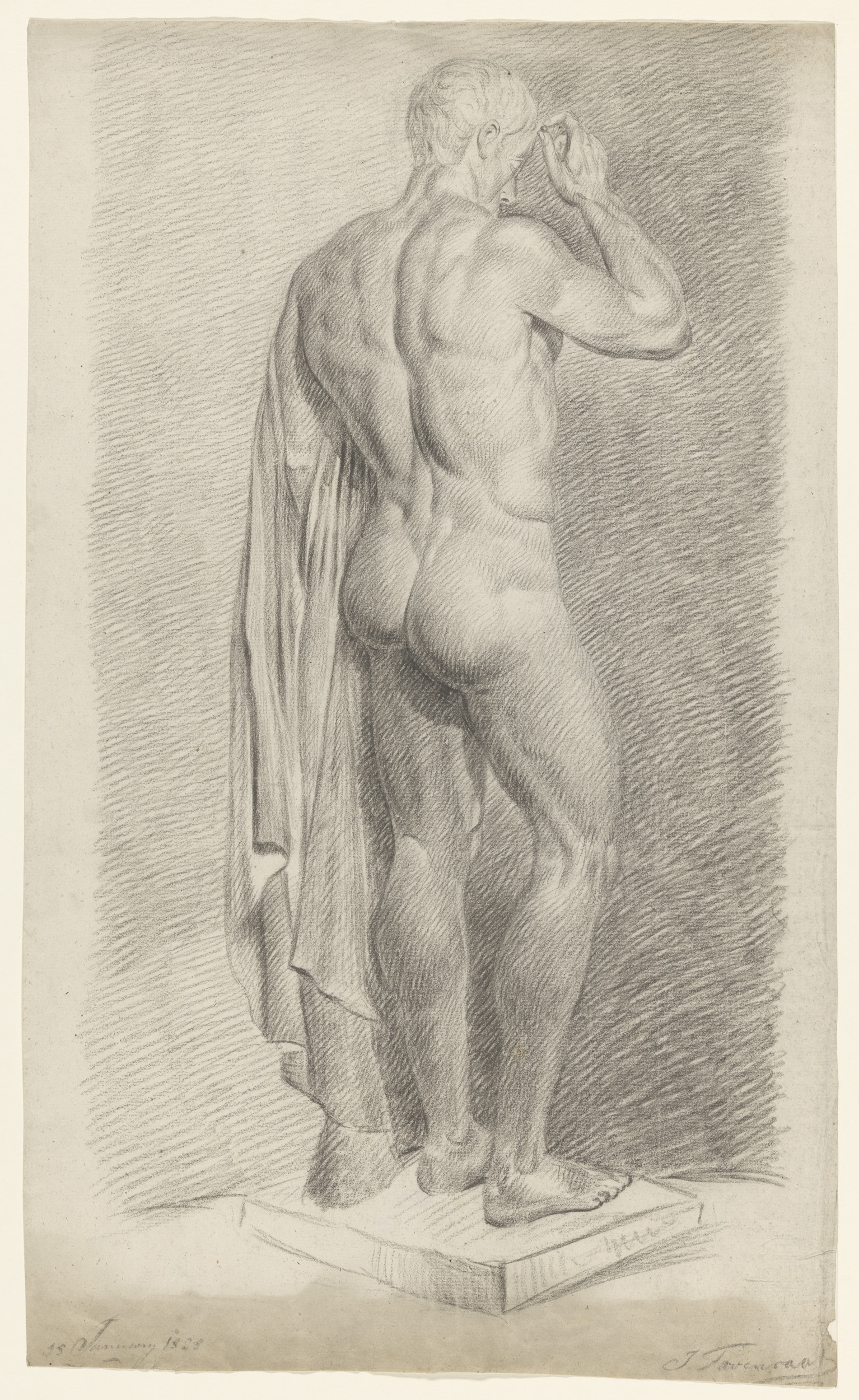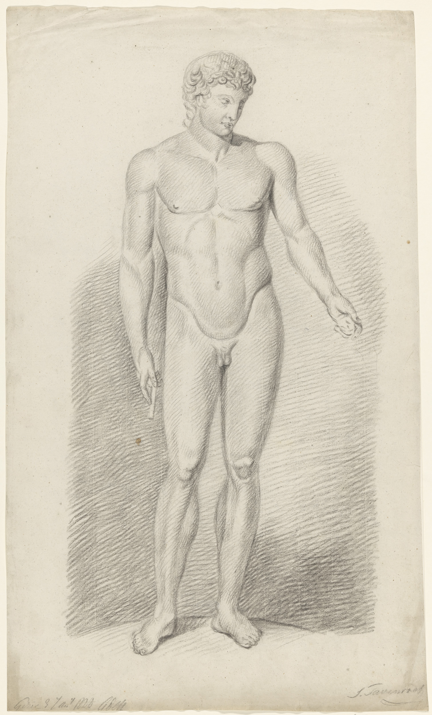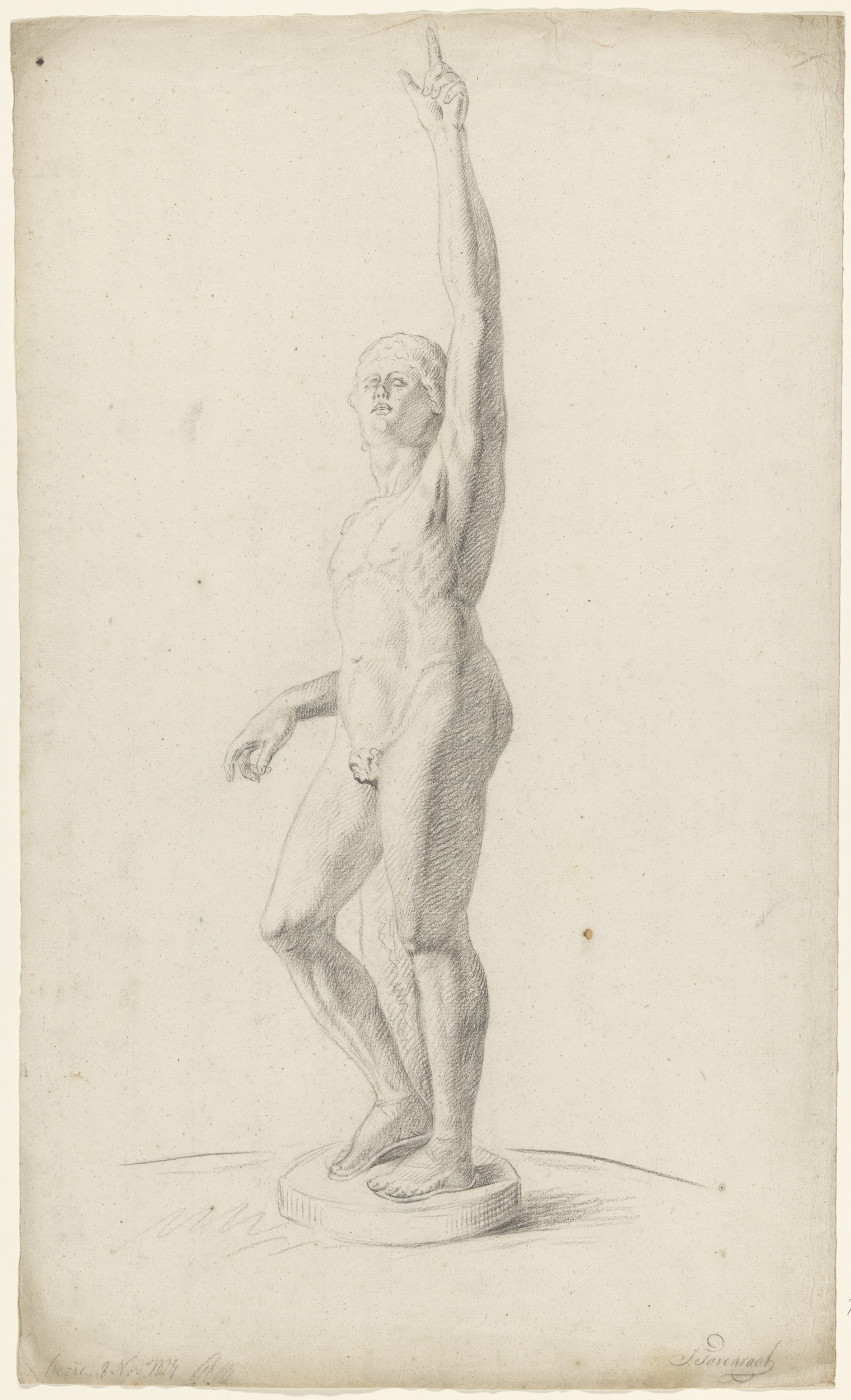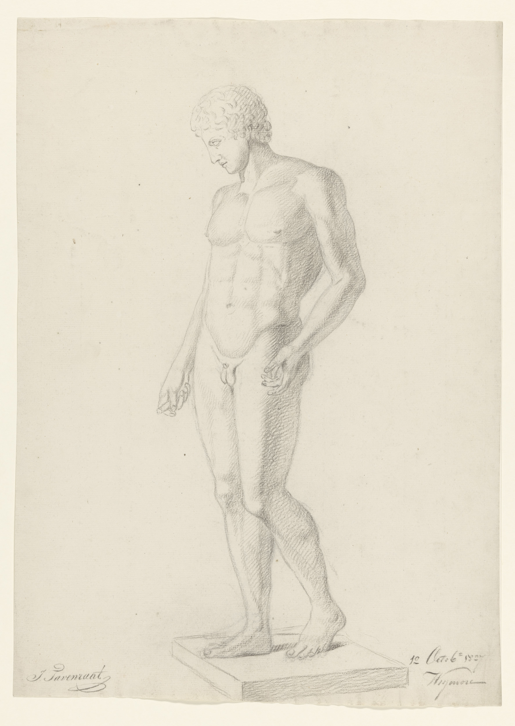Gips van antiek beeld van staande naakt man, met opg...
