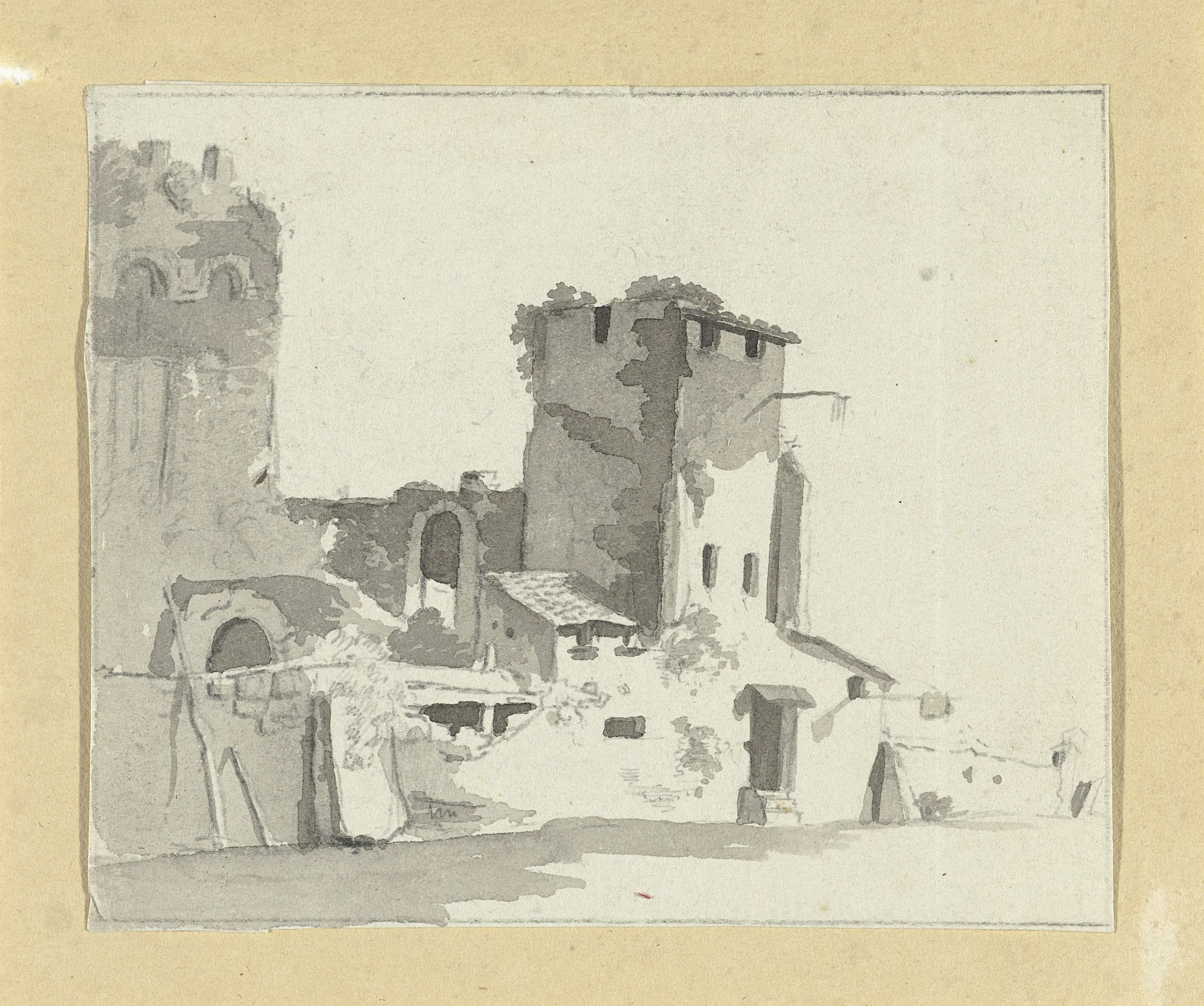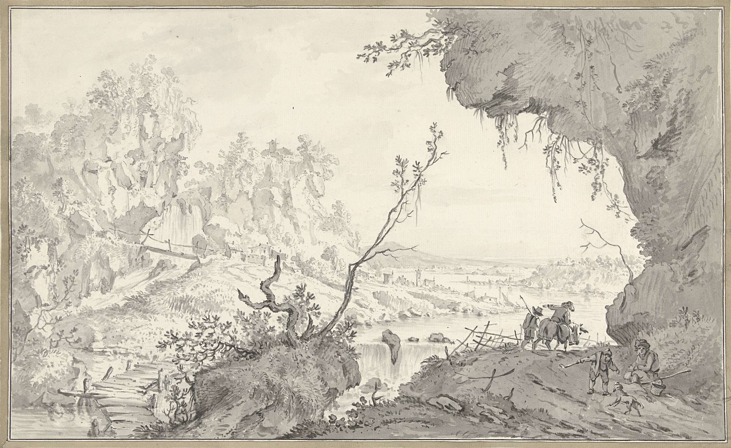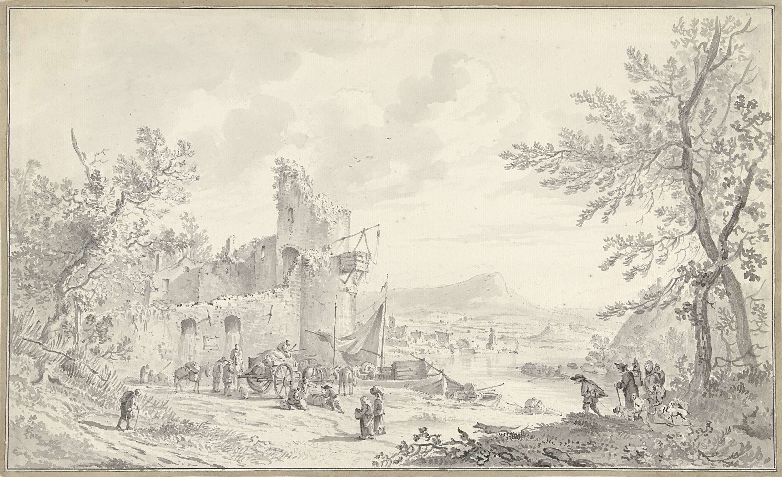 Zuidelijk rivierlandschap met ruïne en kermisklanten