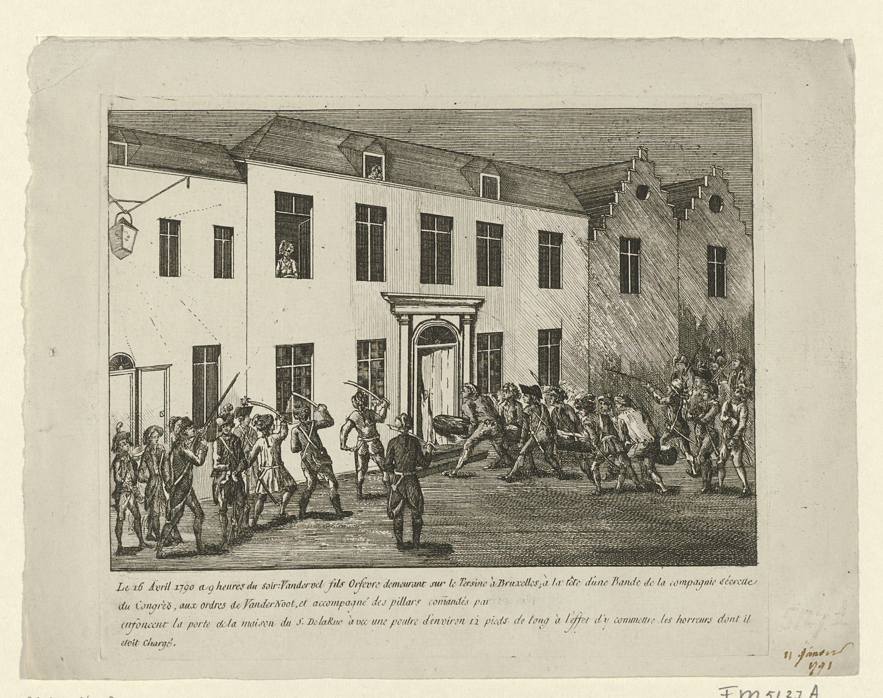 Patriotten rammen de deur van een huis in Brussel