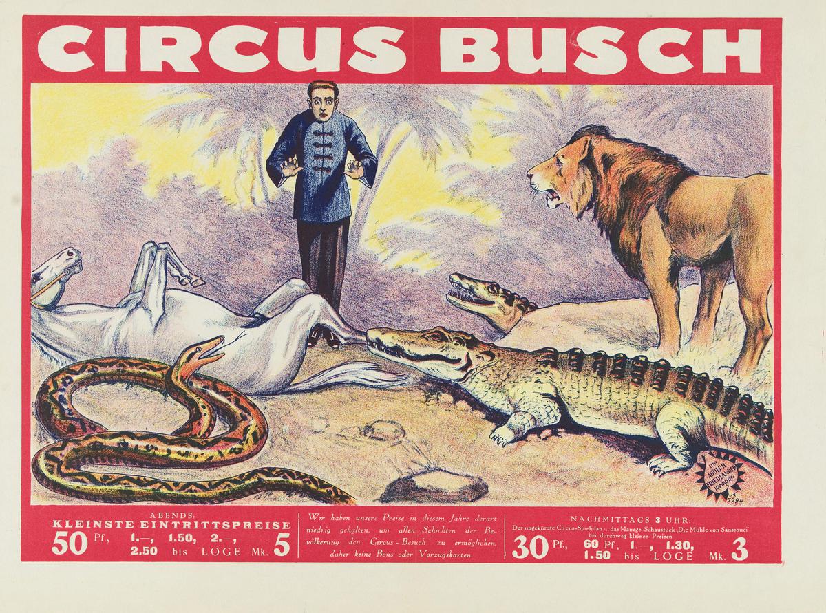 Paard, leeuw, krokodillen, slang en dresseur