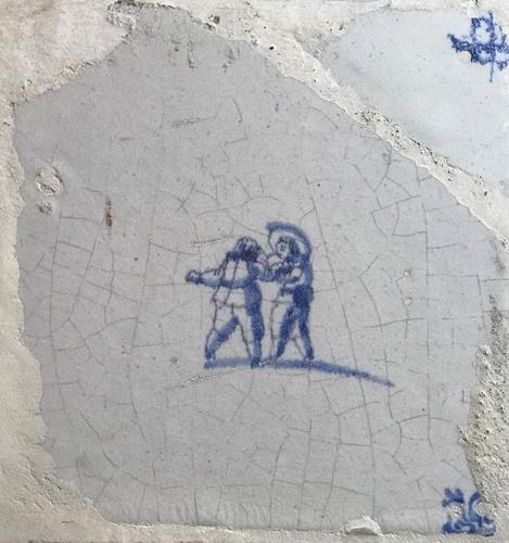 Tegel van aardewerk met tinglazuur voorstellende Gev...