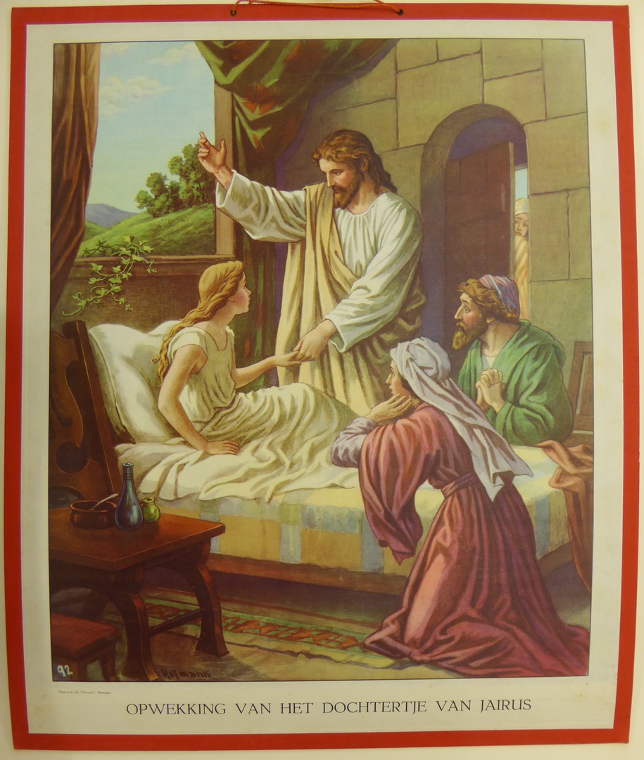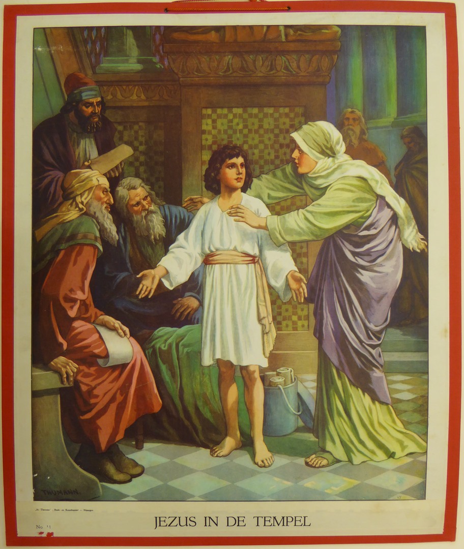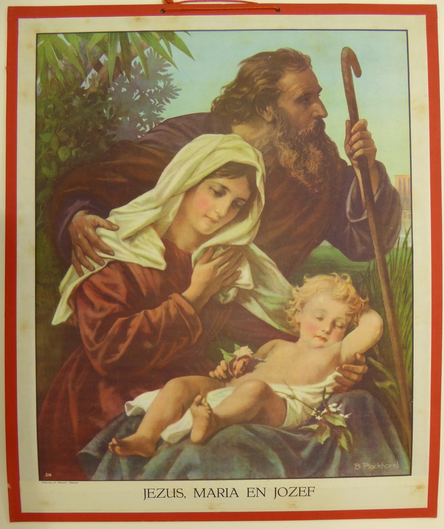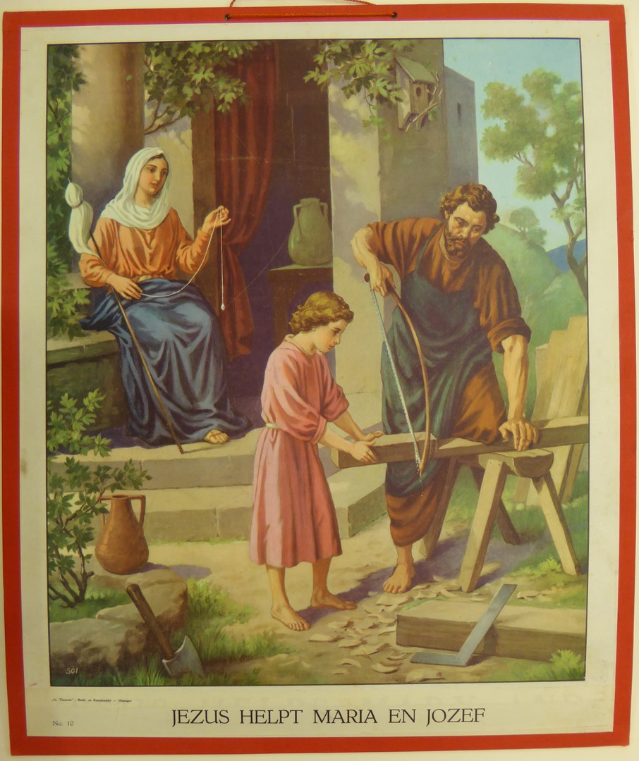 Jezus helpt Maria en Jozef, Maria spint, Jozef zaagt